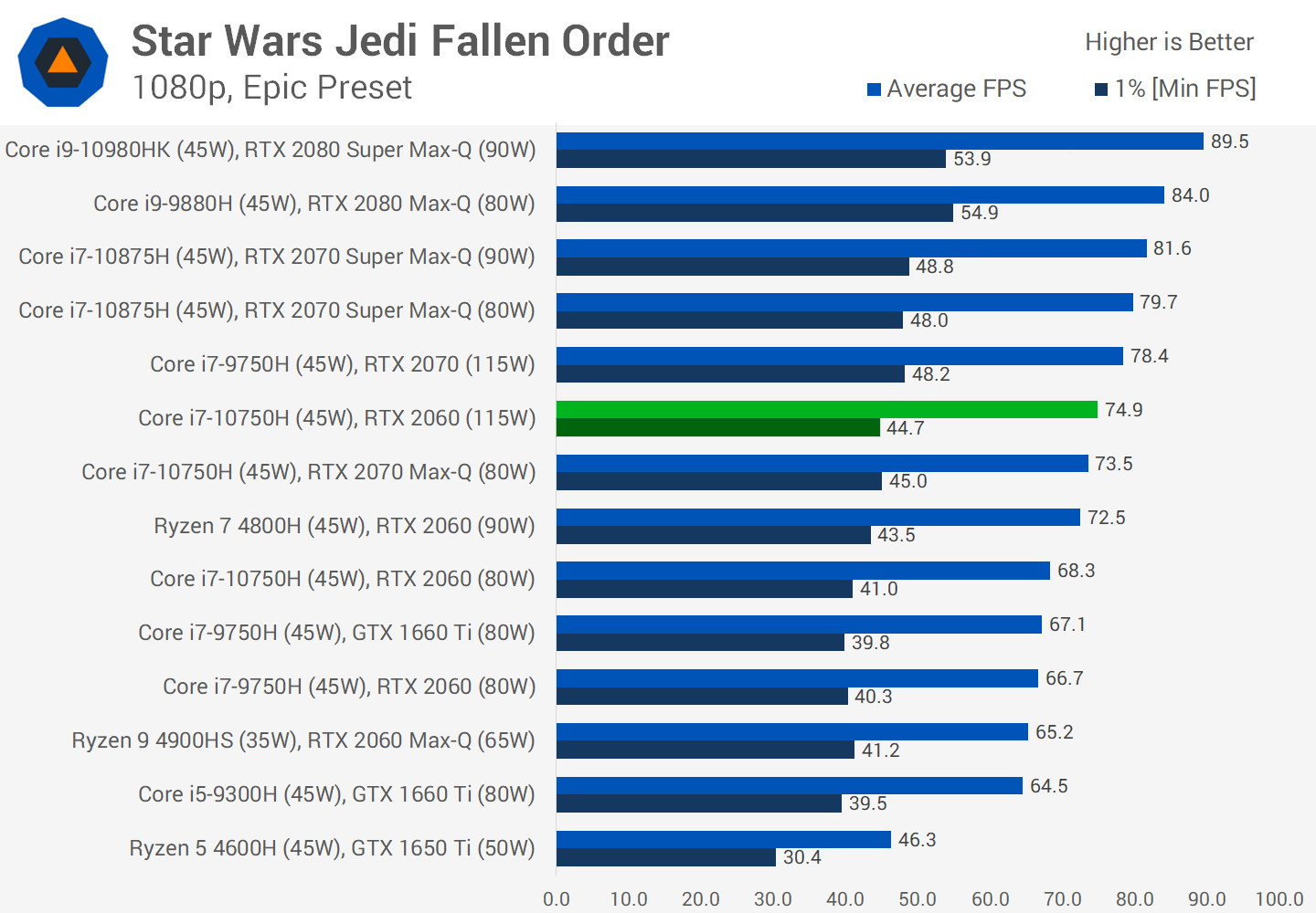 La prochaine étape est celle des super GPU Nvidia qui occupent les premières places du graphique. Star Wars Jedi Fallen Order est principalement limité en GPU dans notre passe de référence sur les ordinateurs portables, ici le 2080 Super Max-Q se classe 10% en avance sur le 2070 Super Max-Q et 14% sur le RTX 2070.