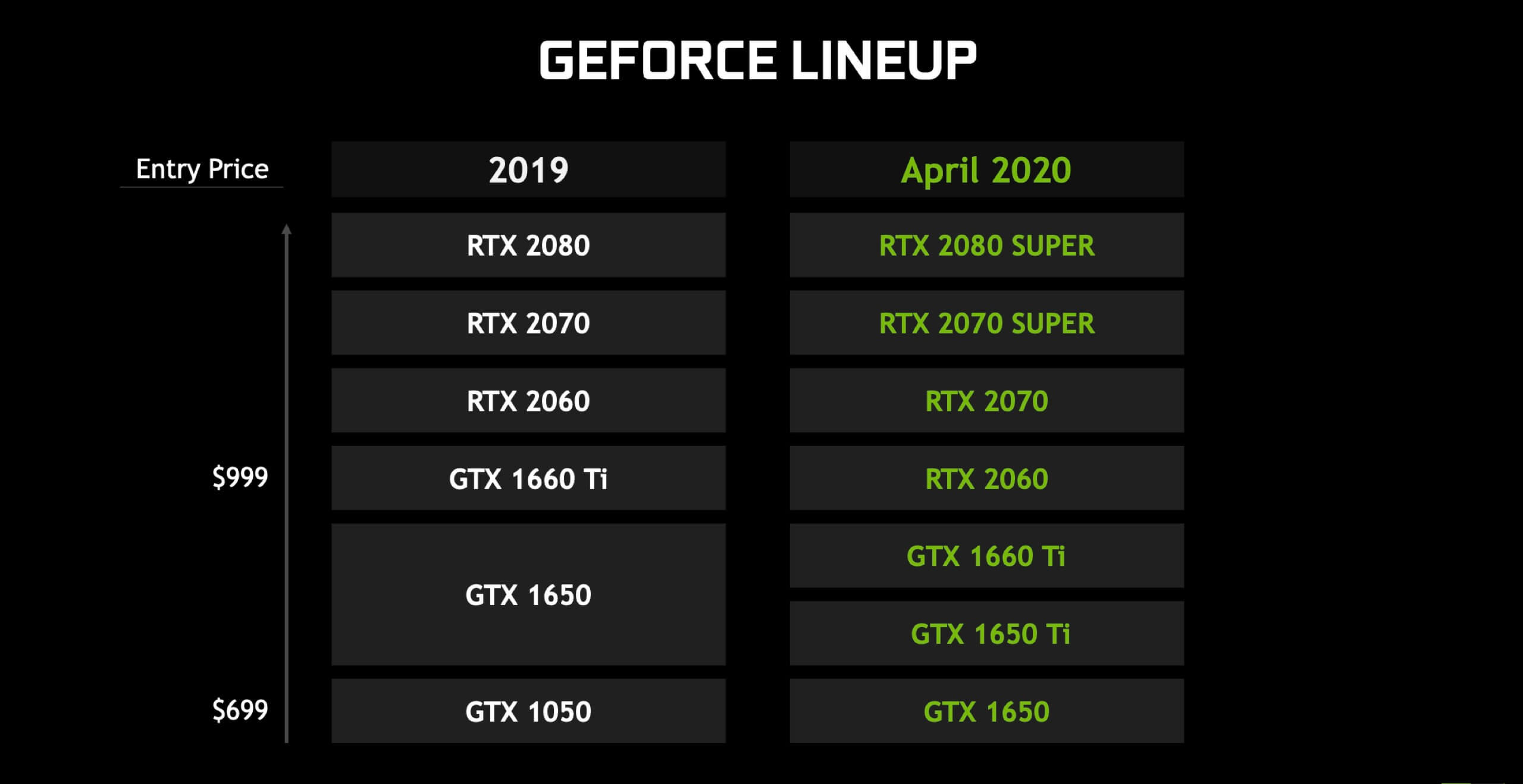 | GeForce RTX 2080 Super | GeForce RTX 2070 Super | GeForce RTX 2070 | GeForce RTX 2060 | GeForce GTX 1660 Ti | GeForce GTX 1650 Ti | GeForce GTX 1650 | |