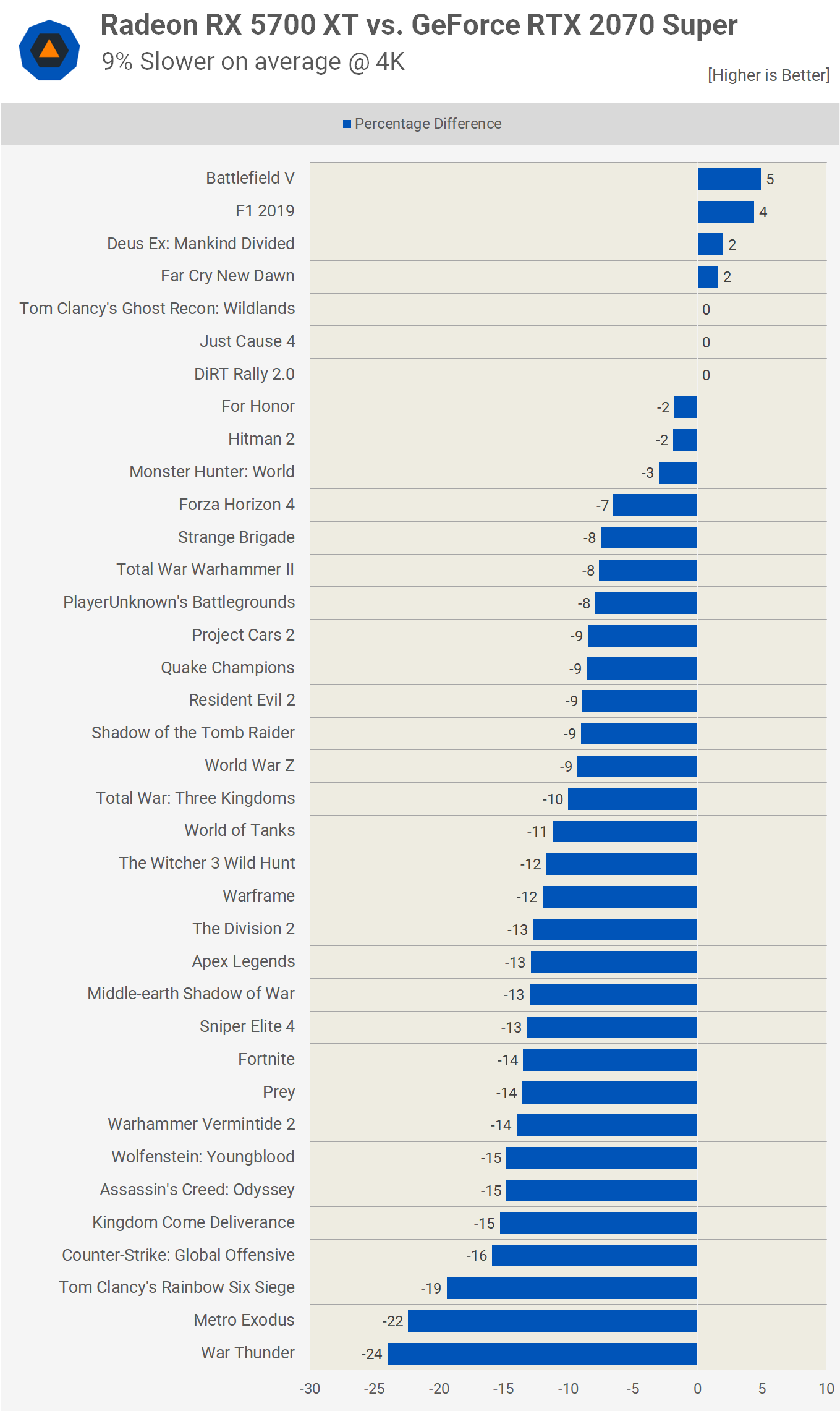 La marge s’élargit à 4K, ici le 5700 XT était 9% plus lent en moyenne et jusqu’à 24% plus lent dans War Thunder et 22% plus lent dans Metro Exodus. Pour ceux qui jouent à 4K, nous pourrions trouver une raison d'acheter le RTX 2070 Super, mais en termes de valeur, le 5700 XT est toujours techniquement meilleur.