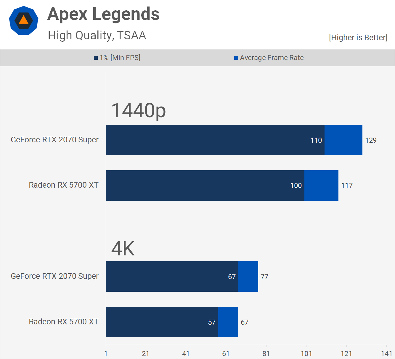 Apex Legends est l’autre jeu où Nvidia a fait un bon pas en avant. Ici, le 2070 Super est maintenant 10% plus rapide à 1440p. Pas assez pour justifier la différence de prix, mais au moins c'est clairement plus rapide dans ce titre maintenant.
