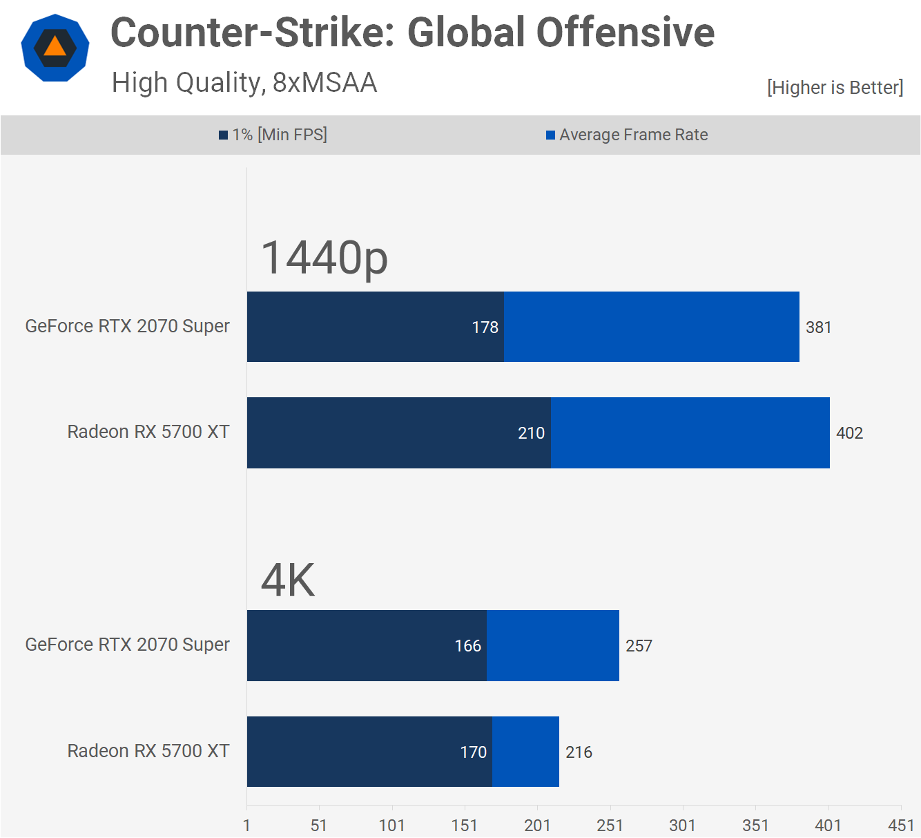 Counter-Strike: GO … apparemment, 300 fps en moyenne est un bon chiffre pour ce jeu. Vous pourrez donc atteindre cet objectif à 1440p avec l'une ou l'autre des cartes graphiques utilisant des paramètres de qualité visuelle maximum, ce qui n'est pas ce que les jeux de compétition utilisent nécessairement. les réglages concurrentiels s’attendent… environ 1 000 images par seconde ou tout ce que votre processeur peut supporter.
