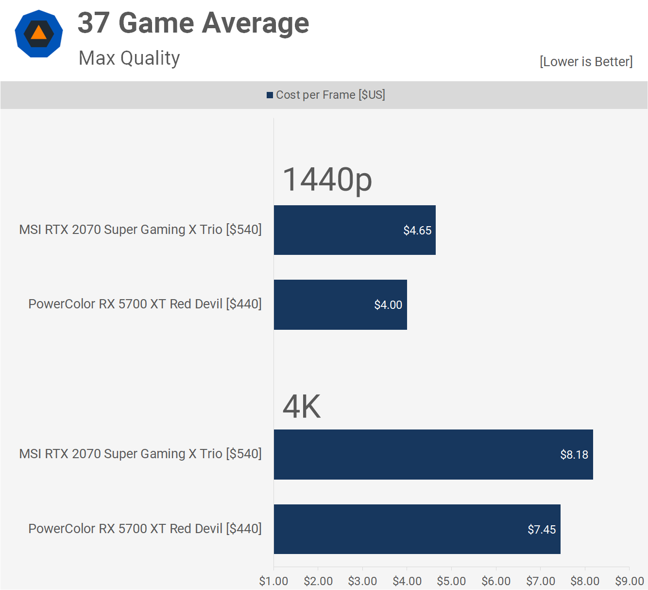 Voici maintenant un aperçu du coût par image. Le 5700 XT (PowerColor Red Devil) est proposé à un coût de 4 USD par image à 1440p, soit 14% de moins que le Trio MSI RTX 2070 Super Gaming X.