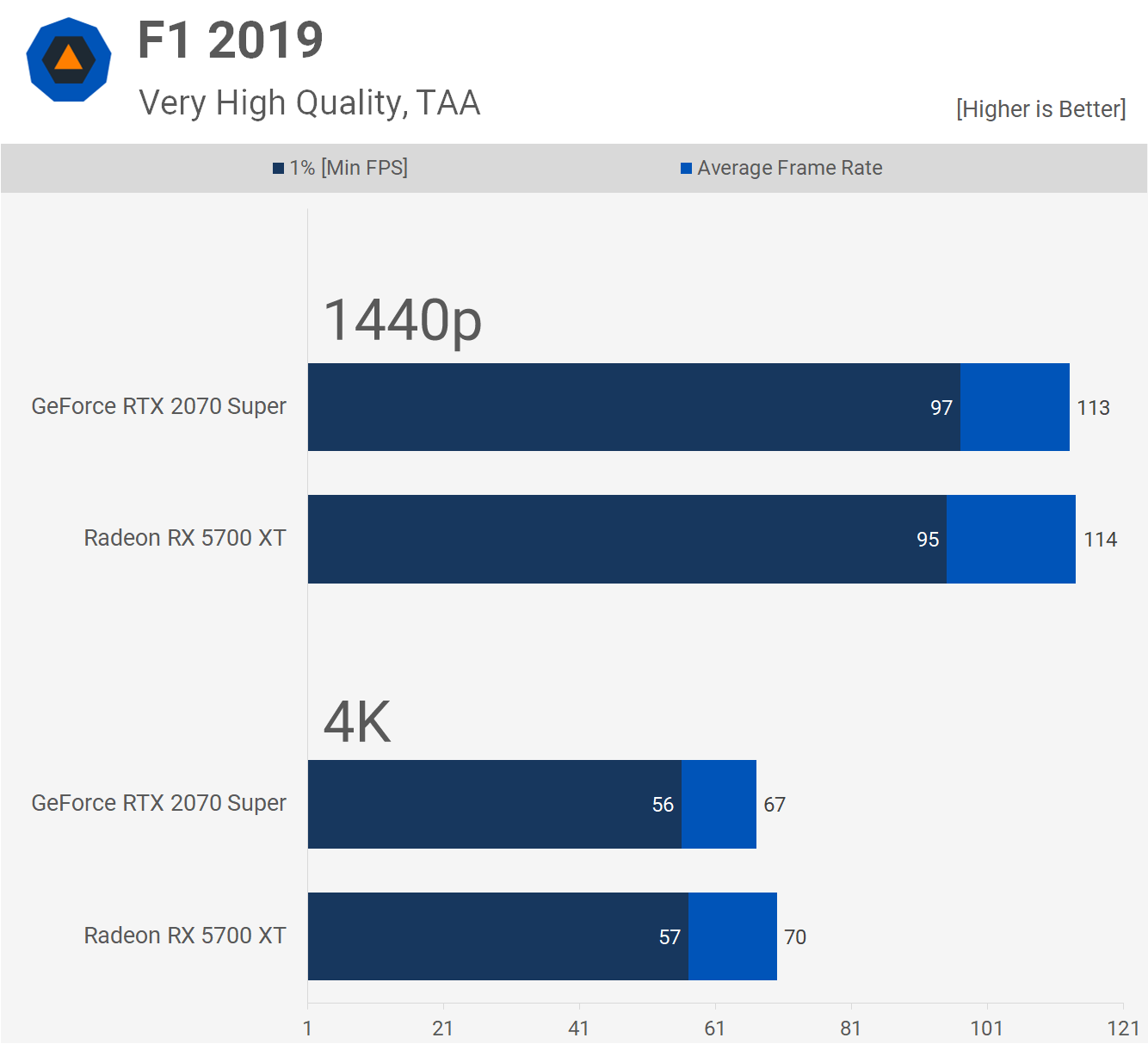 Les taux de trame en F1 2019 sont compétitifs. En gros, nous visons des performances identiques en utilisant l’un ou l’autre des GPU. Le 5700 XT était plus rapide à 4K, mais dans l’ensemble, vous envisagez une expérience de jeu très similaire.