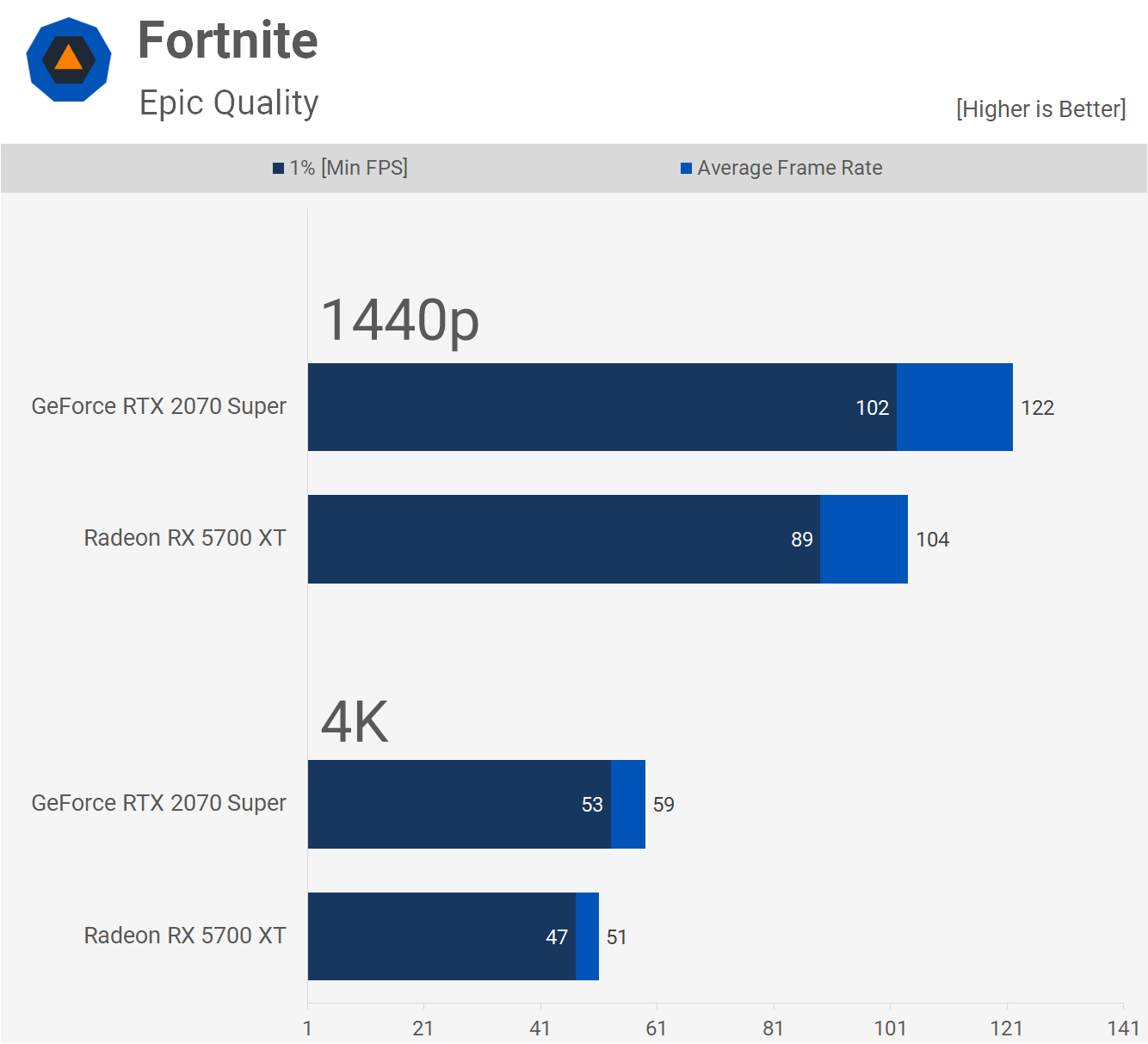 Les joueurs férus de Fortnite voudront utiliser un GPU GeForce. La RT 2070 Super était en moyenne 17% plus rapide à 1440p, ce qui est presque suffisant pour justifier l'augmentation de 25% du prix. Une bonne performance pour Nvidia cependant, si vous utilisez des paramètres plus bas lorsque vous parlez de 400 $ + GPU, cela n’a probablement aucune importance.