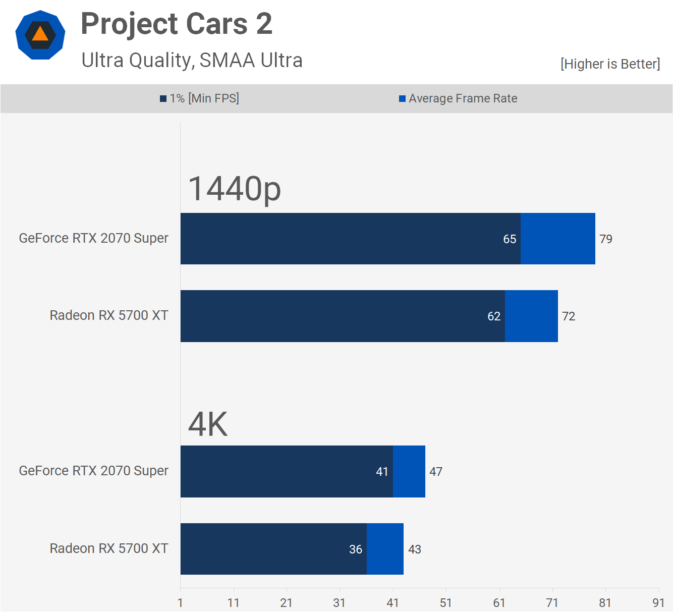 Project Cars 2 a généralement beaucoup favorisé les GPU GeForce. Néanmoins, le 2070 Super n’est que 10% plus rapide à 1440p, ce qui n’est pas une marge importante compte tenu de la différence de prix. Il était également 6% plus rapide lorsque l'on comparait 1% de données basses et nous constatons que les performances sont également assez proches à 4K.