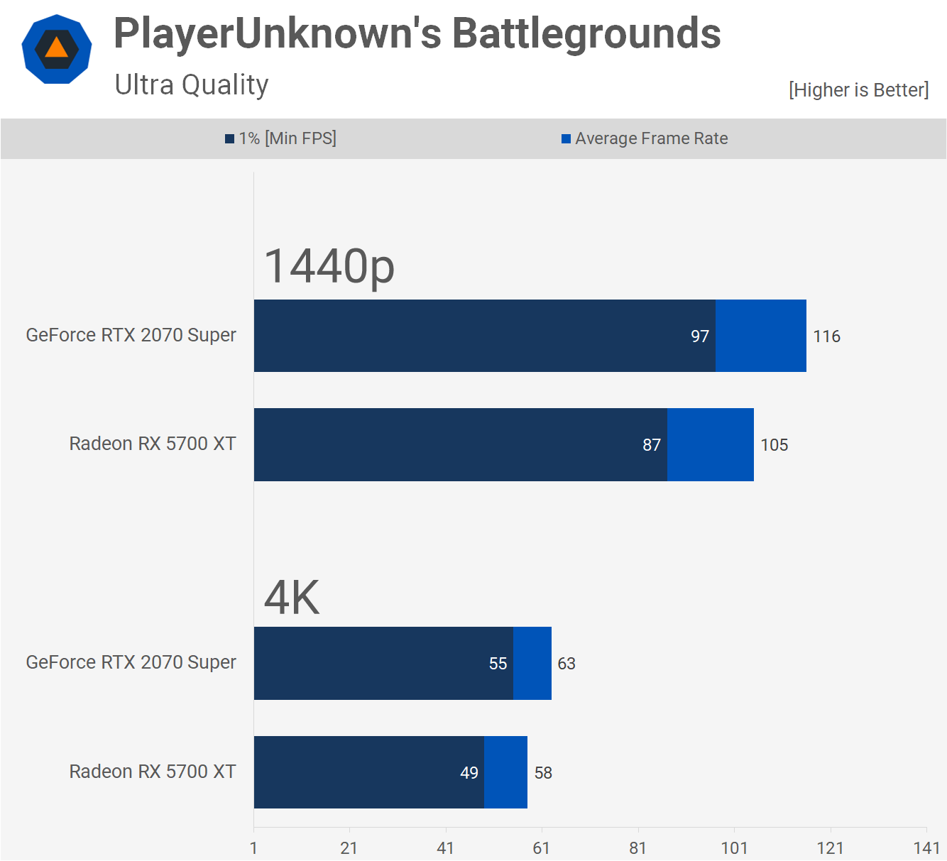 Dans les champs de bataille de PlayerUnknown, la GeForce se comporte 10% plus vite à 1440p et 9% plus vite à 4K. Avec des paramètres esports "compétitifs", les deux maintiendront bien plus de 100 fps à tout moment.