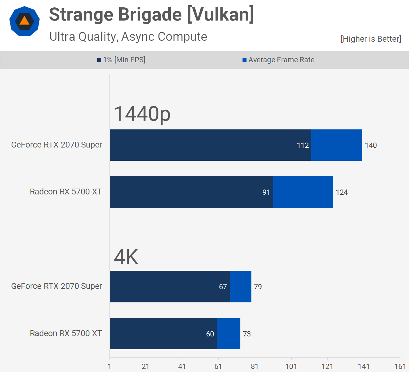 Nvidia a légèrement amélioré ses performances dans Strange Brigade et maintenant, le 2070 Super est un peu plus rapide que le 5700 XT, offrant 12% de performances en plus à 1440p et un résultat bas de 23% plus robuste.