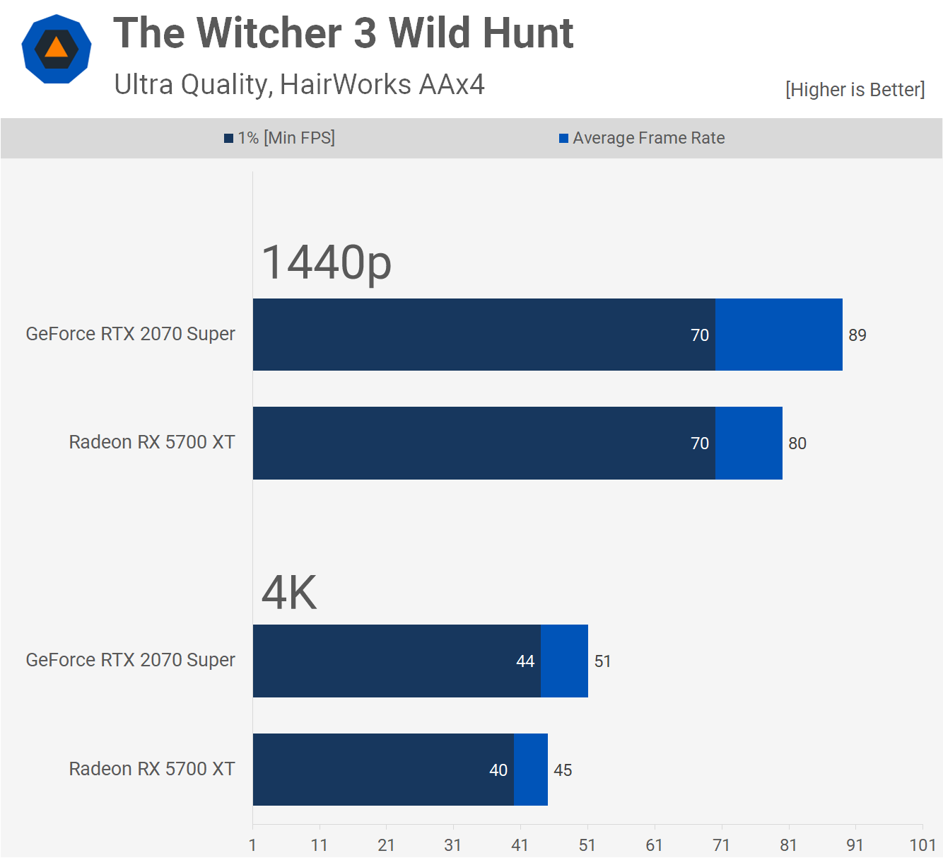 The Witcher 3 Wild Hunt est un autre vieux banger très sollicité. Certes, c’est un jeu de qualité qui reste très exigeant. La RTX 2070 Super a fourni 11% de cadres supplémentaires en moyenne à 1440p, bien que nous constations des performances identiques identiques de 1%.