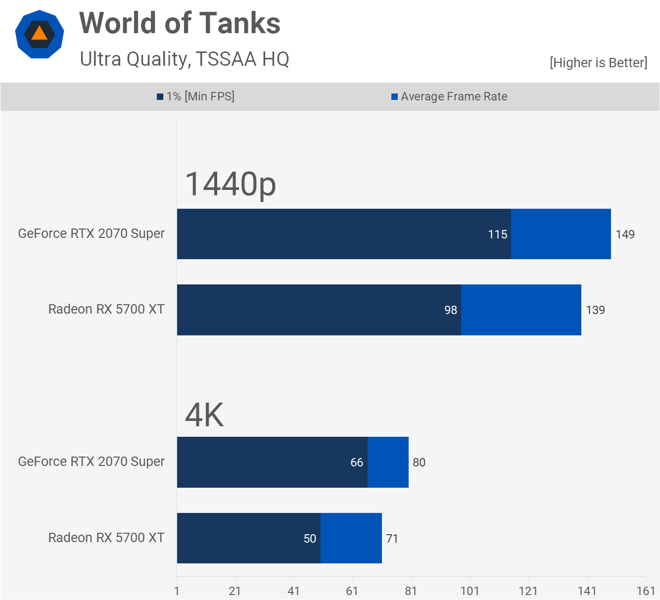 Enfin, nous avons World of Tanks, où le Super 2070 était 7% plus rapide en moyenne à 1440p avec des moyennes de plus de 130 images par seconde pour les deux GPU.