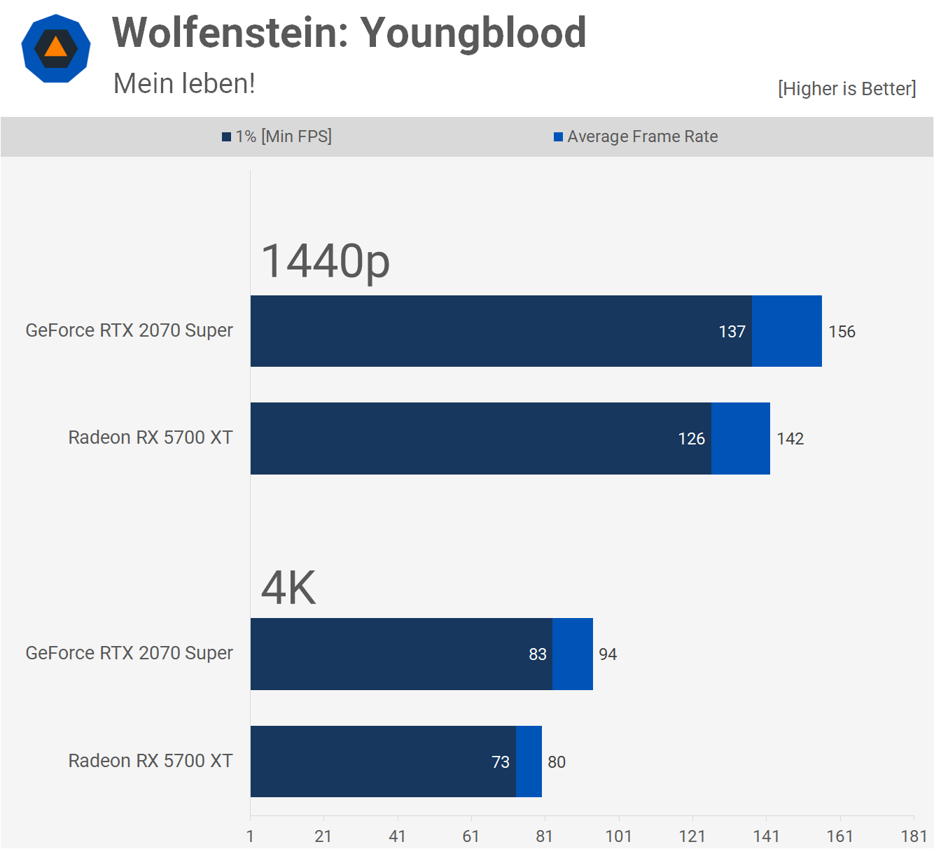 Wolfenstein: Youngblood joue mieux sur le Super 2070, bien qu’à 1440p avec des réglages de qualité maximum, nous voyons toujours plus de 120 images par seconde avec le 5700 XT, alors à vous de décider combien de performances supplémentaires de 10% compte.