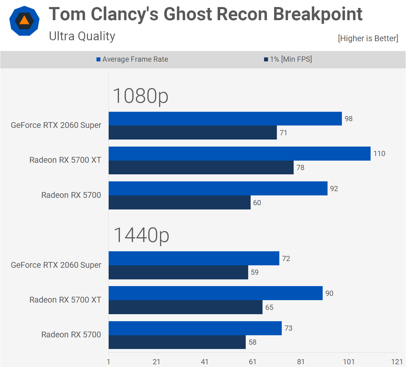 Lors des tests avec Ghost Recon Breakpoint, le modèle 5700 était au niveau ou moins rapide que le Super 2060 Super, mais le modèle XT présente un net avantage en termes de performances: il offre 12% de performances supplémentaires en 1080p et 25% supplémentaires à 1440p.