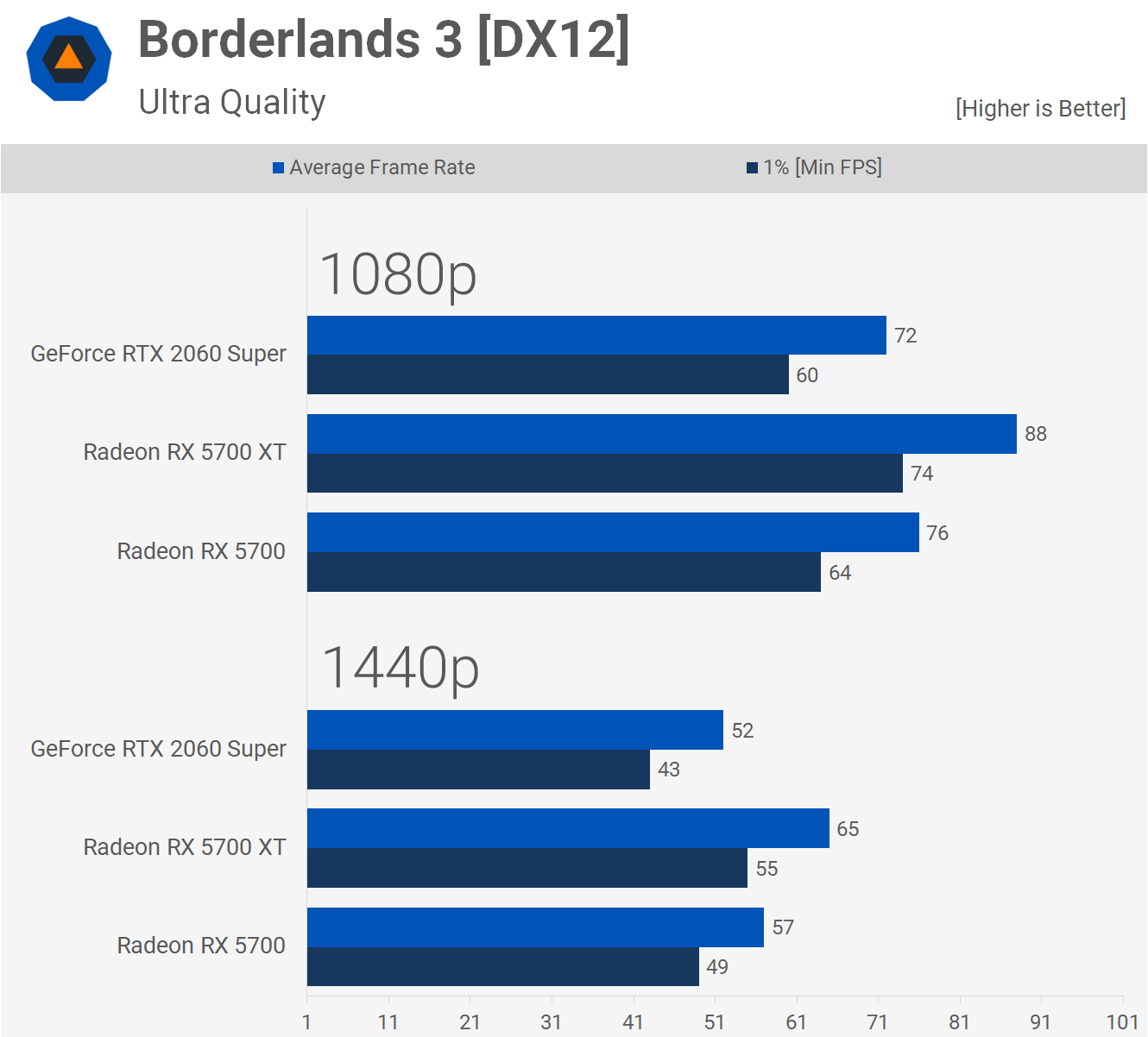 Nous allons commencer par Borderlands 3 et étant donné que c’est un titre où le 5700 bat le Super 2060, il n’est guère surprenant que le XT soit encore plus rapide, battant le GPU GeForce avec une marge de 25% à 1440p.
