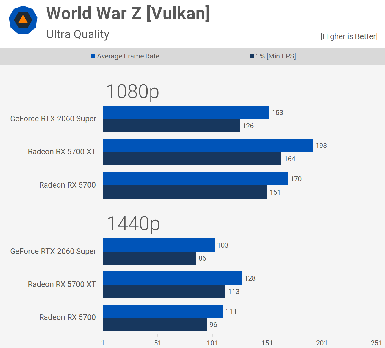 Passant à la deuxième guerre mondiale, le 5700 étant déjà plus rapide, c’est une victoire facile pour le 5700 XT, qui a battu le RTX 2060 Super de 26% en 1080p et 1440p.