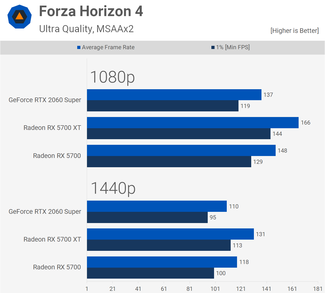 Lors des tests avec Forza Horizon 4, les performances de l’XT étaient supérieures de 12% à celles du modèle 5700 standard. Cela signifiait qu’il était 21% plus rapide que le modèle 2060 Super. Nous constatons également une marge de performance similaire à 1440p, ici la Radeon 5700 XT a battu la GeForce de 19%.