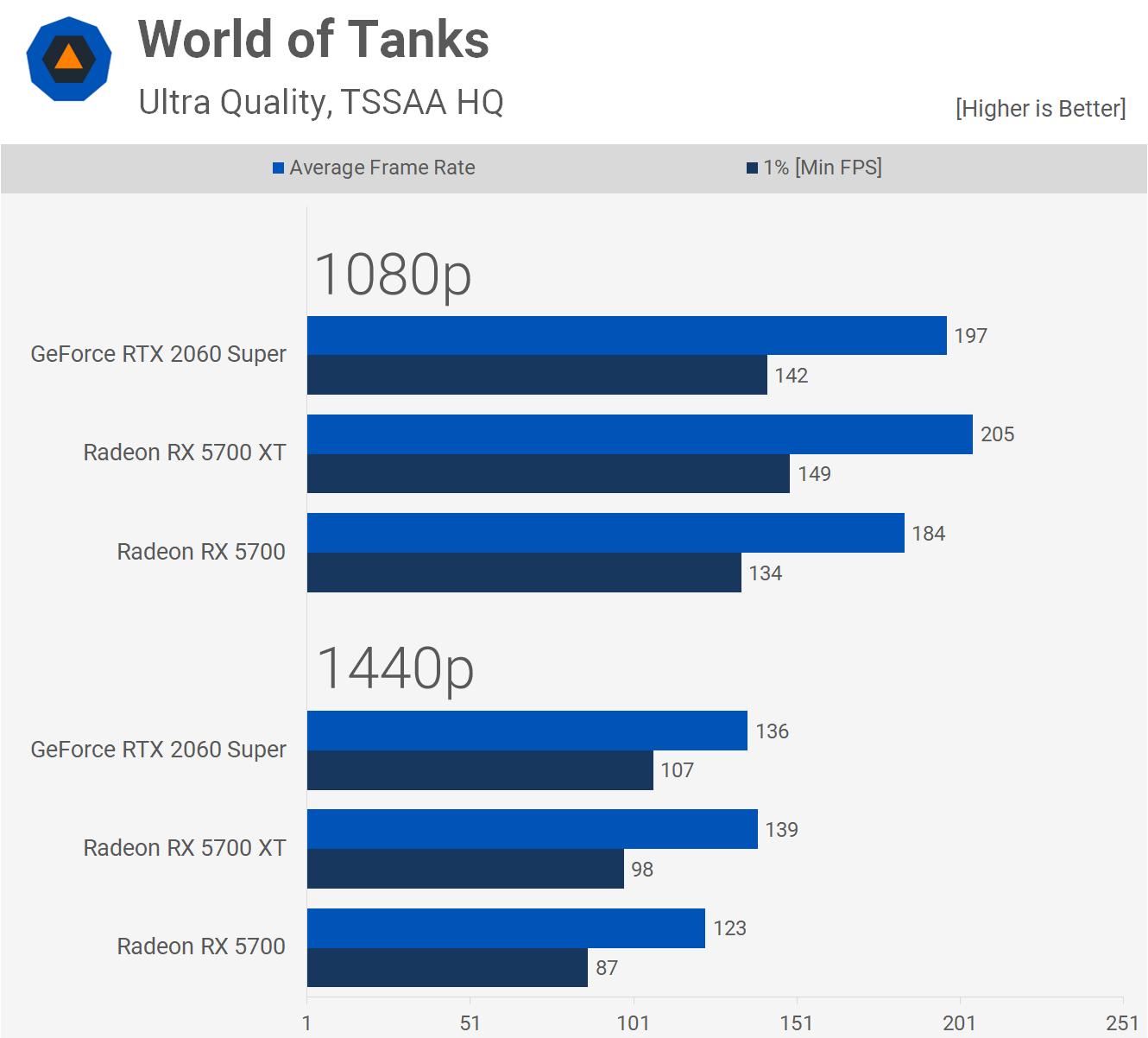Enfin, examinons World of Tanks où le 5700 XT est capable de devancer le Super 2060, bien qu’il soit un peu en retrait à 1440p lorsque l’on observe un faible rendement de 1%.