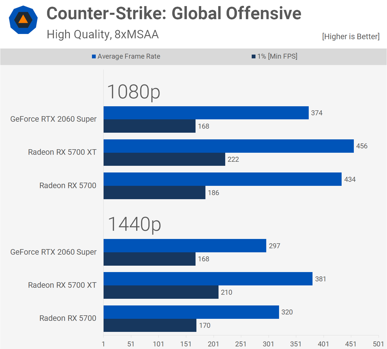 AMD est dominante dans Counter-Strike: Global Offensive. Par conséquent, si vous êtes au maximum de la vitesse en pieds par seconde, le 5700 XT est le chemin à parcourir au point de prix de 400 $ offrant une performance environ 30% supérieure à 1440p.
