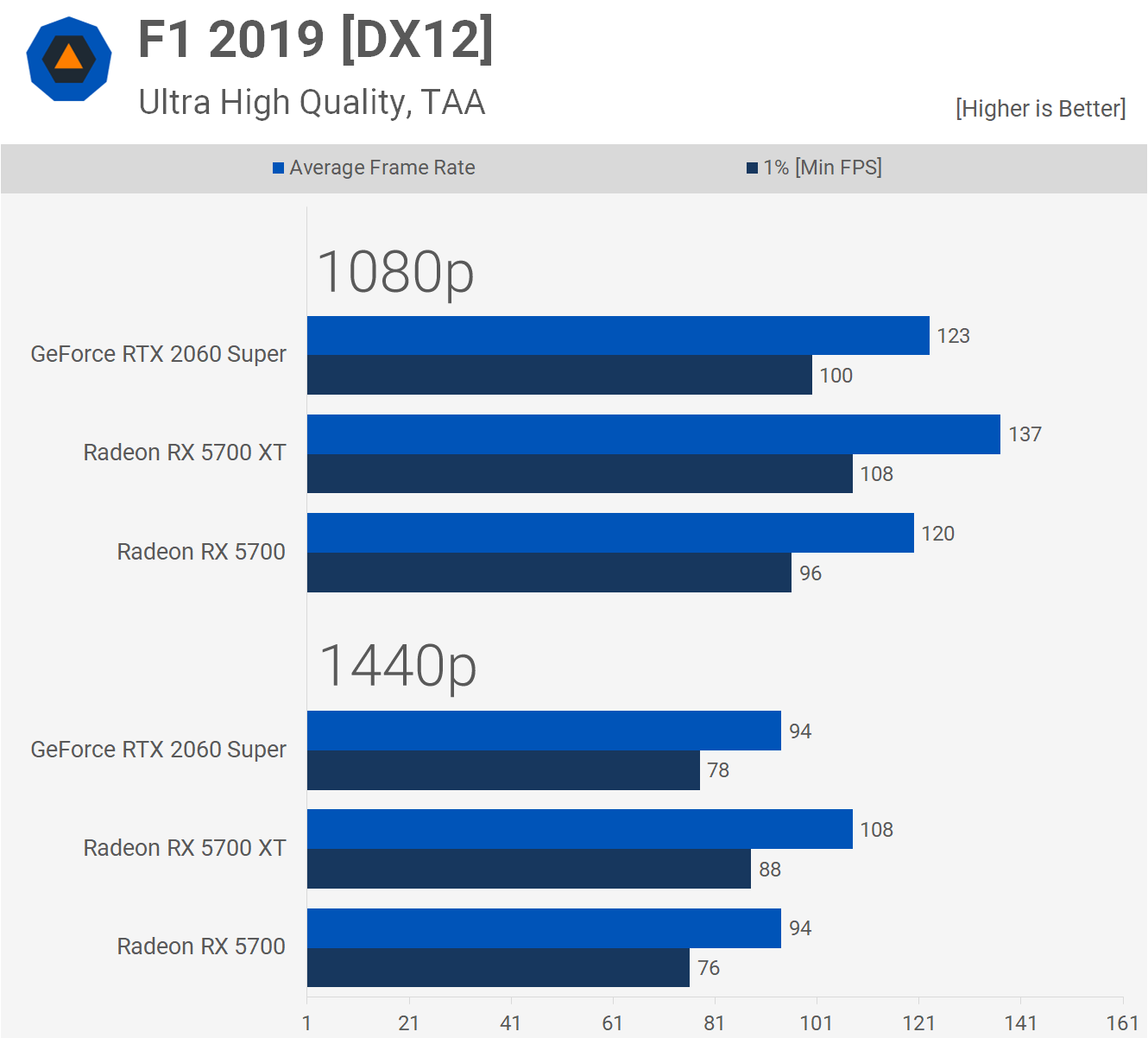 La F1 2019 a vu les modèles 5700 et 2060 Super offrir des performances comparables dans les deux résolutions testées, ce qui a permis au modèle XT de fournir 11% d'images supplémentaires en 1080p et 15% supplémentaires à 1440p.
