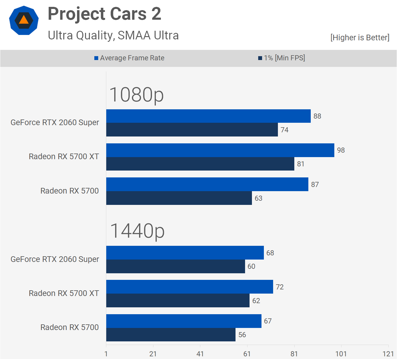 Même lors des tests avec Project Cars 2, un jeu qui favorise généralement l'équipe verte, le 5700 XT est capable de vaincre le 2060 Super. Cette fois-ci par une marge de 11% à 1080p, et seulement 6% à 1440p.