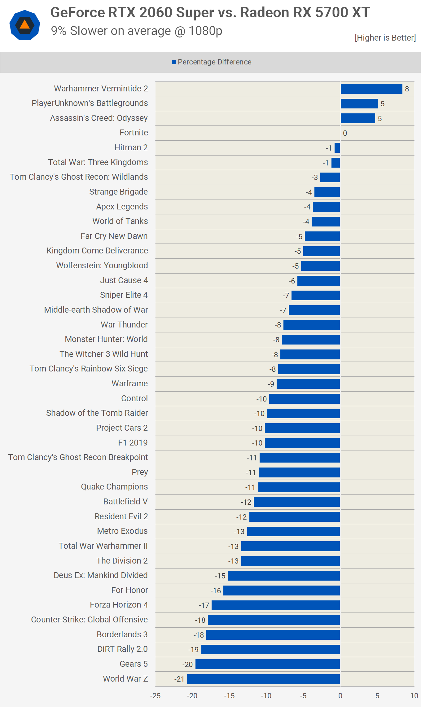 Pour le reste du peloton, le RTX 2060 Super était plus lent de 10% ou plus dans 17 des 41 matchs testés.