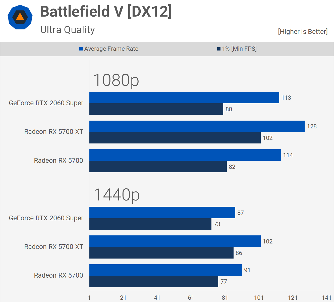 Le 5700 XT offre 13% de performances en plus en 1080p et 17% de plus en 1440p. Une autre victoire facile pour AMD à Battlefield V.