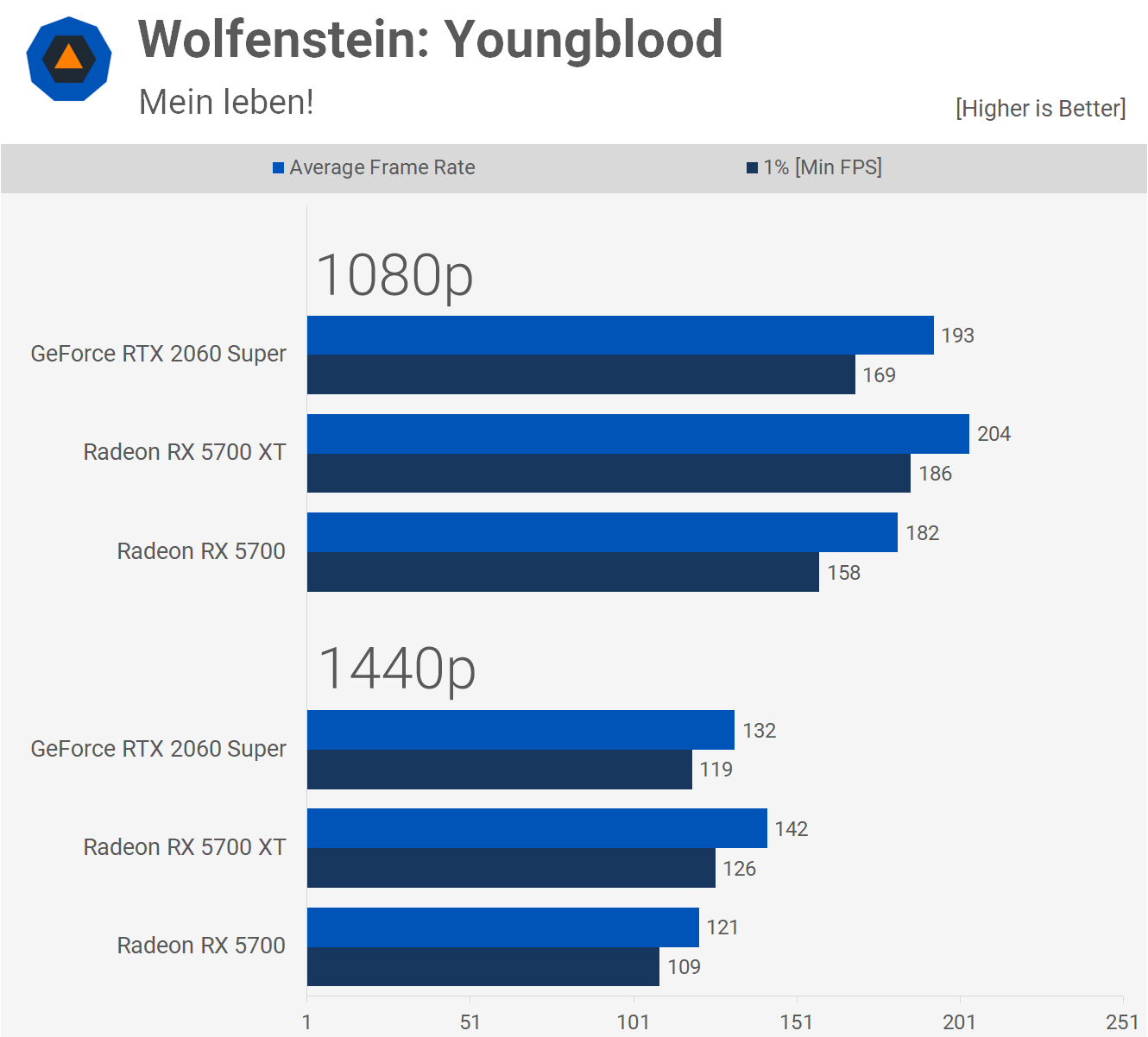 Wolfenstein: Youngblood est un autre exemple de lenteur dans laquelle le RX 5700 était plus lent que le 2060 Super, mais le modèle XT est en mesure de corriger cela, gagnant par une marge de 6% à 1080p et de 8% à 1440p.