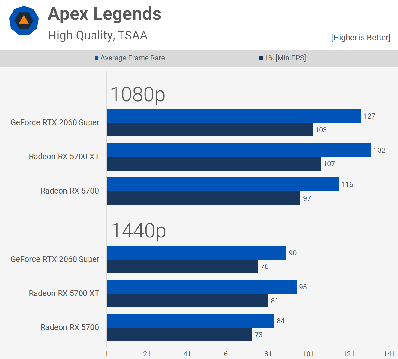 Dans Apex Legends, les marges sont beaucoup plus étroites. Il n’ya que 5 images par seconde aux deux résolutions testées, mais le 5700 XT reste en tête.