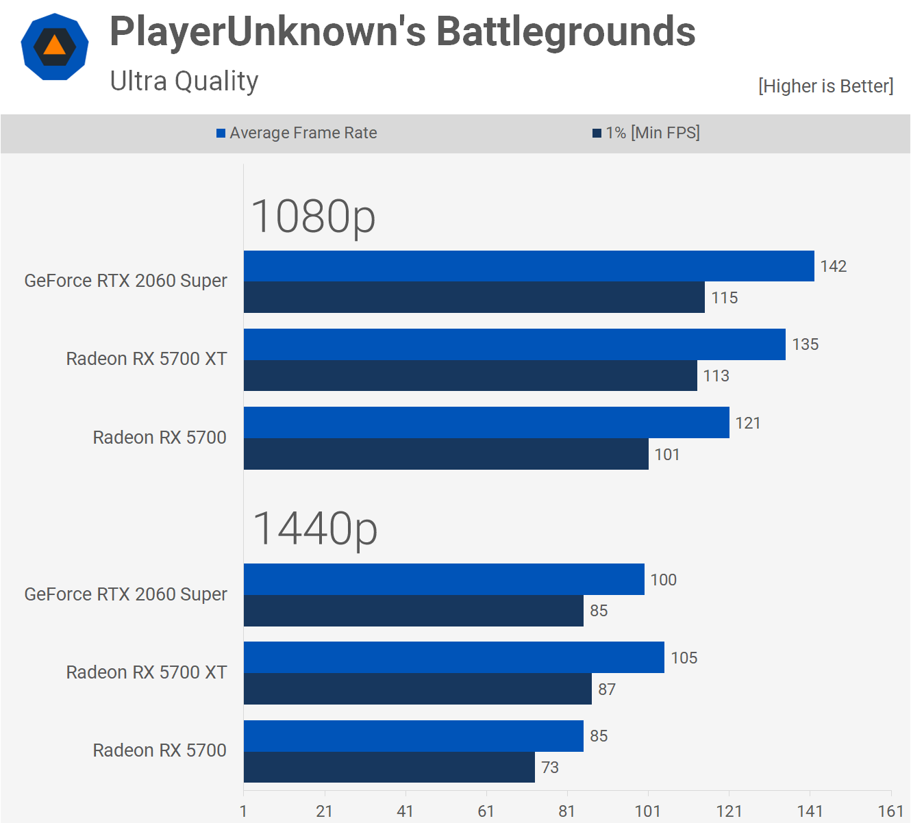 Le 5700 XT occupe une place prépondérante dans les champs de bataille de PlayerUnknown et, bien qu’il soit un peu plus lent en 1080p, le GPU Radeon prend le dessus à 1440p de peu.