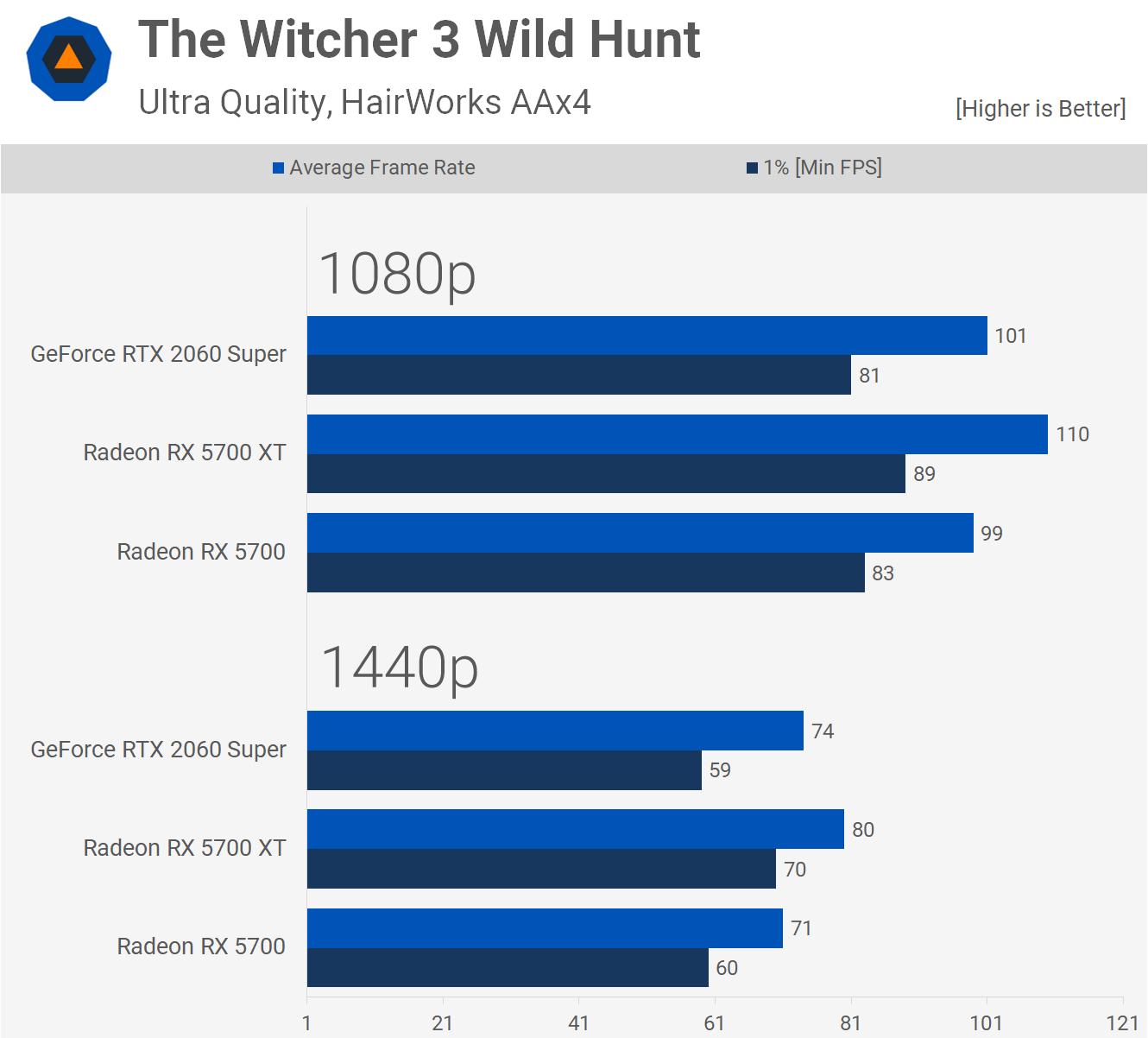 Dans The Witcher 3, le 5700 XT était 9% plus rapide en 1080p et 8% plus rapide en 1440p par rapport au RTX 2060 Super. Il offrait également une performance considérablement plus faible de 1% à la résolution supérieure.