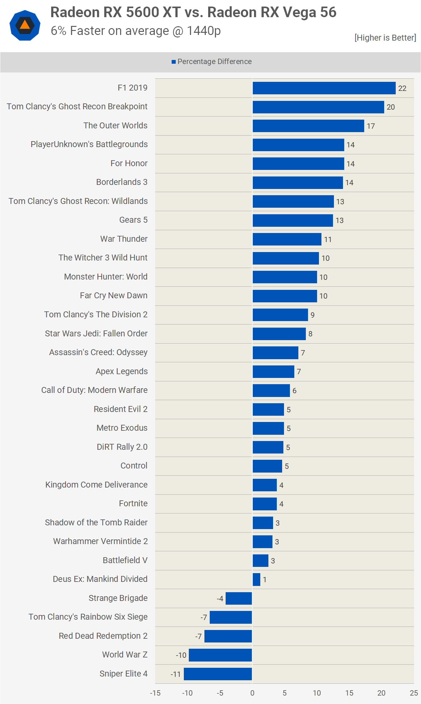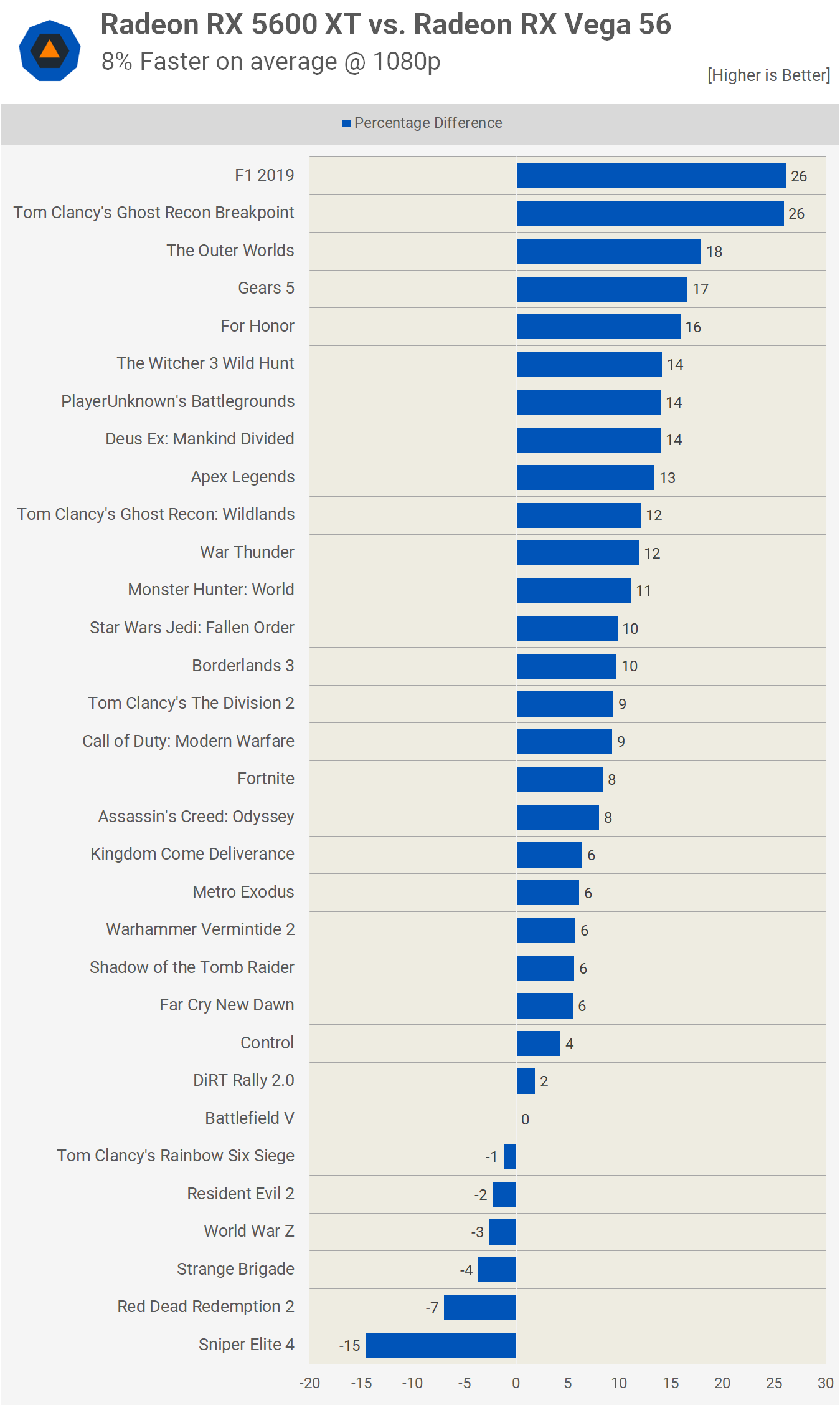 Étant donné l'énorme masse de la puce Vega 56 et le fait qu'elle contient plus de transistors, beaucoup plus de cœurs et une mémoire HBM2 sportive pour une augmentation de plus de 20% de la bande passante, c'est remarquable ce qu'AMD a réalisé avec la puce Navi beaucoup plus petite. Oui, une partie des gains peut être attribuée au processus 7 nm, mais il y a aussi une grande partie de cela qui peut être attribuée à l'architecture RDNA. Avant d'aller trop loin dans cette conversation, voici un aperçu de la façon dont Vega 56 et 5600 XT se comparent tête à tête dans les 32 titres que nous avons testés.