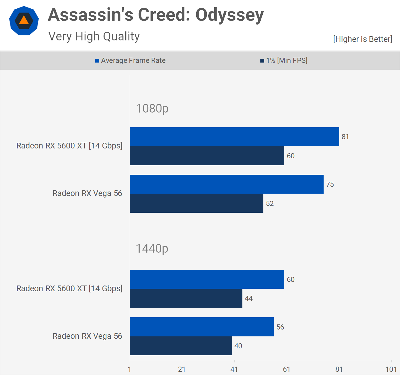 Tout d'abord, nous avons l'Assassin’s Creed Odyssey et ici le 5600 XT était 8% plus rapide que le Vega 56 à 1080p et 7% plus rapide à 1440p. Ce n'est pas une énorme différence, mais étant donné combien le 5600 XT est plus efficace, c'est vraiment un énorme pas en avant pour AMD.