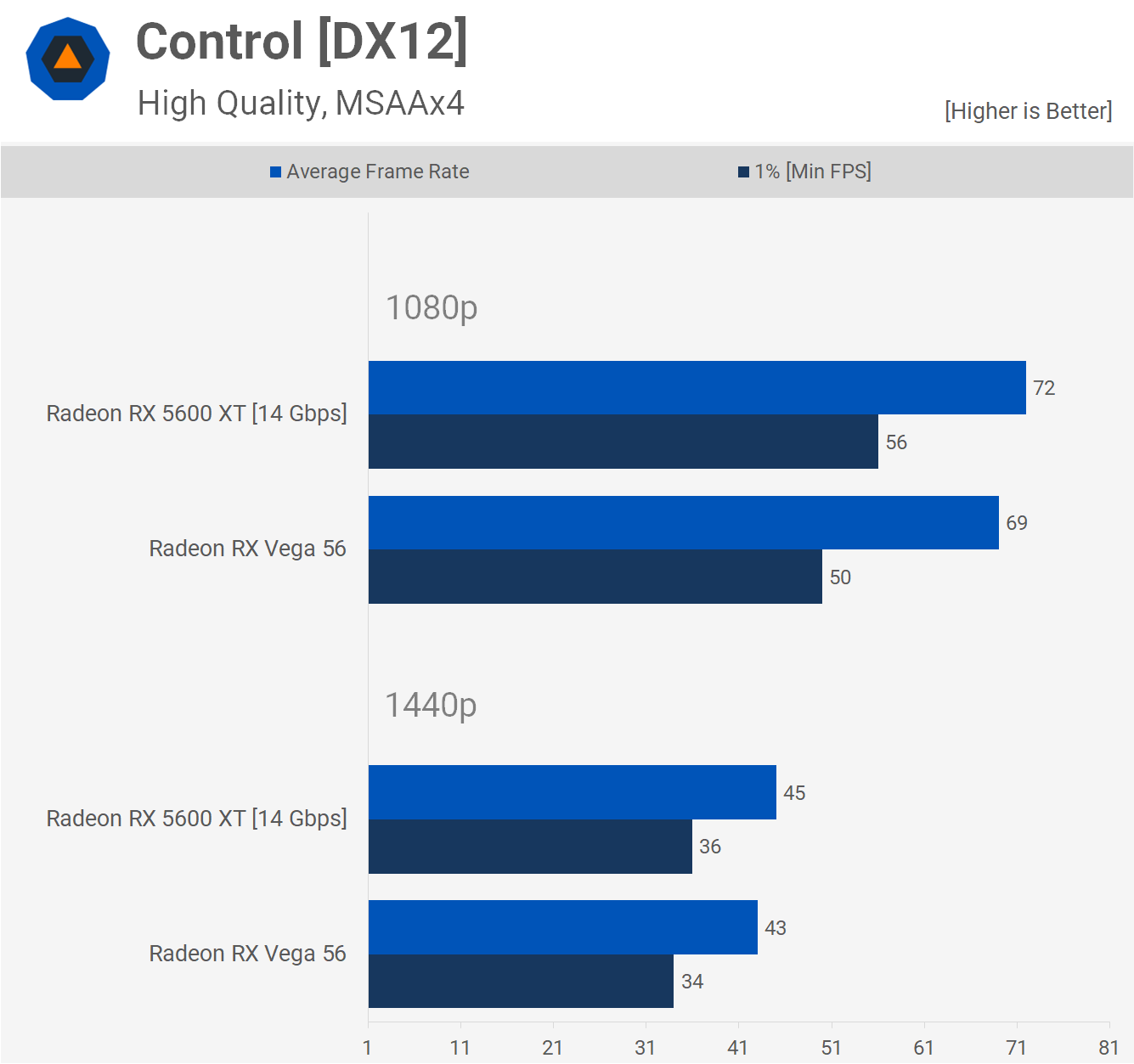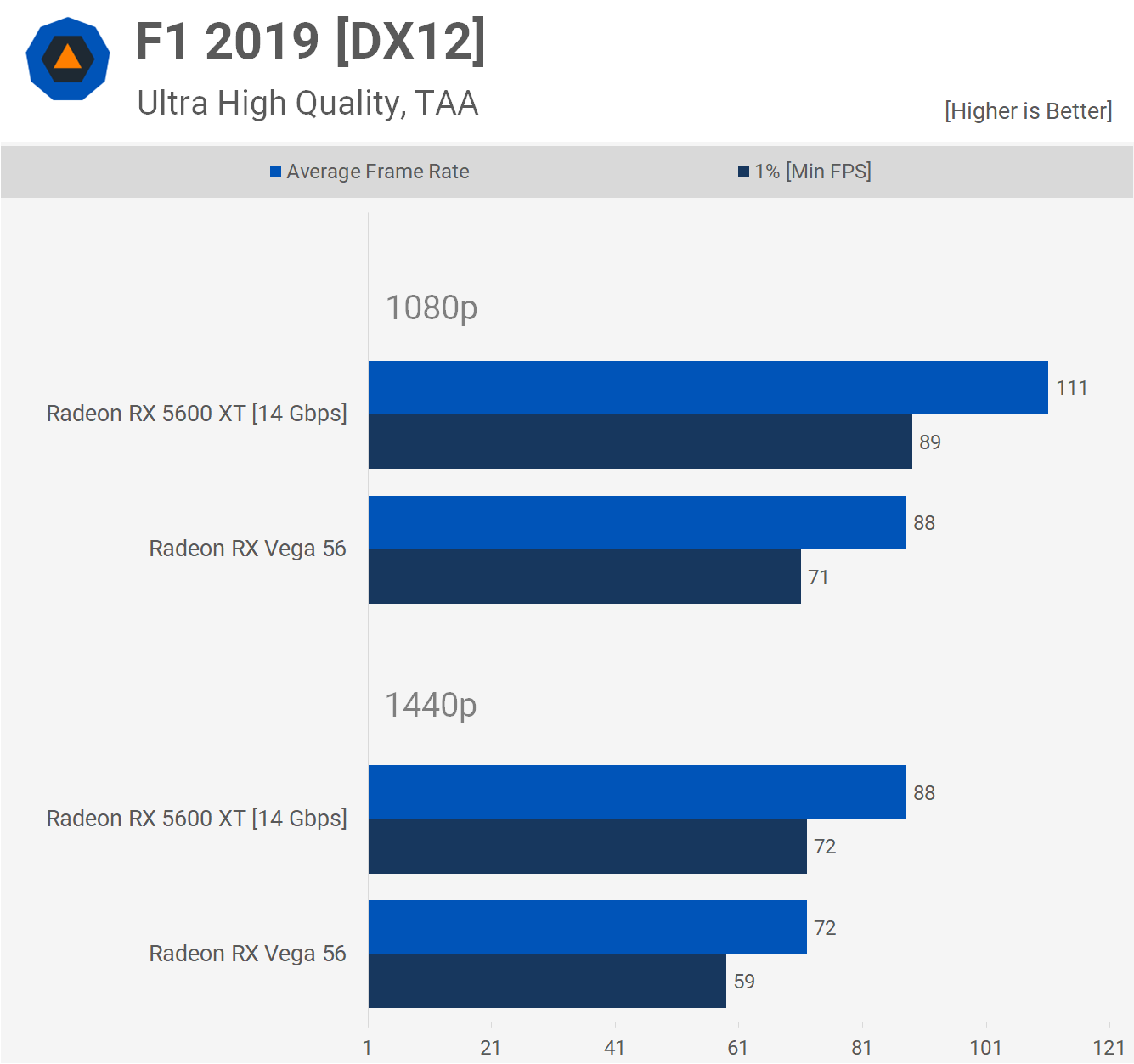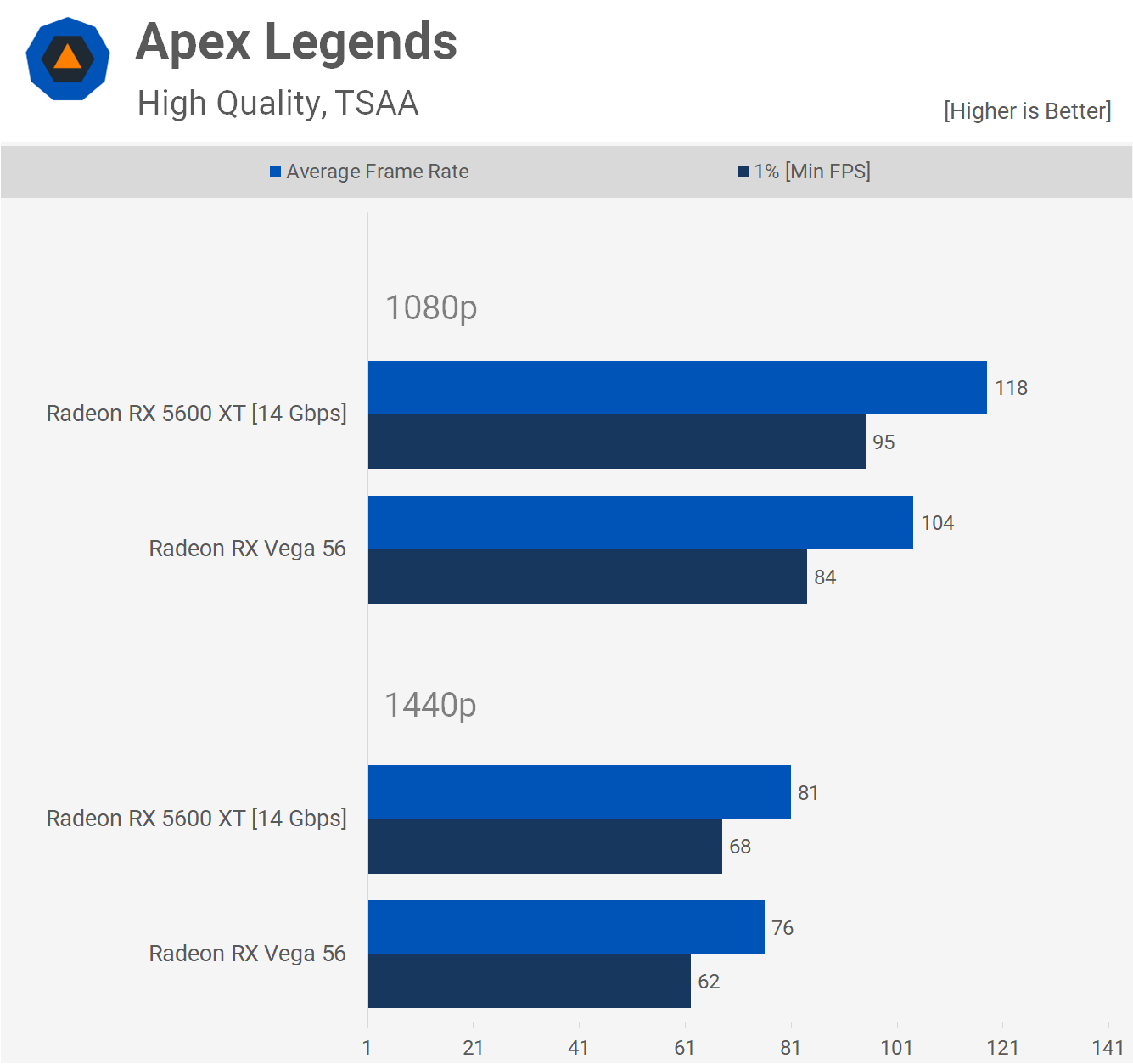 Une augmentation de performance de 13% plus typique est observée lors des tests avec Apex Legends à 1080p et comme nous l'avons vu à plusieurs reprises maintenant, la marge est réduite à 1440p, cette fois à 7% en faveur du 5600 XT.