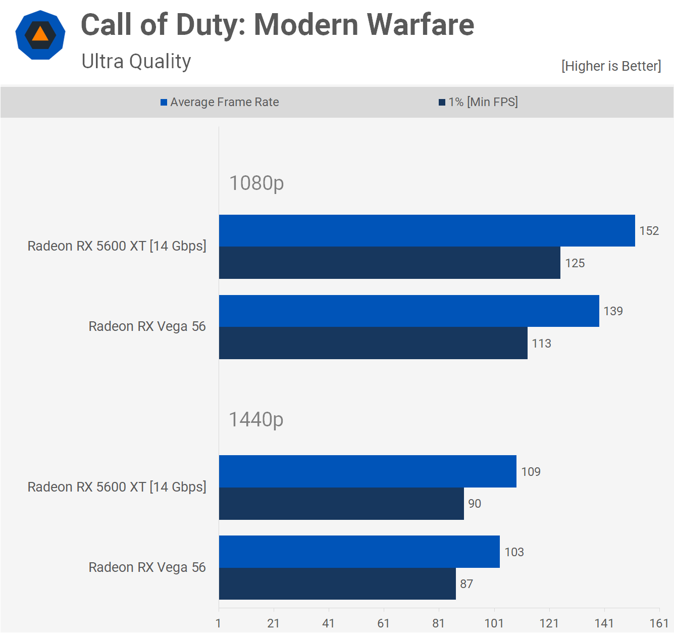Nous revenons à un avantage de performance de 9% en faveur du 5600 XT lors des tests avec Call of Duty Modern Warfare en 1080p.