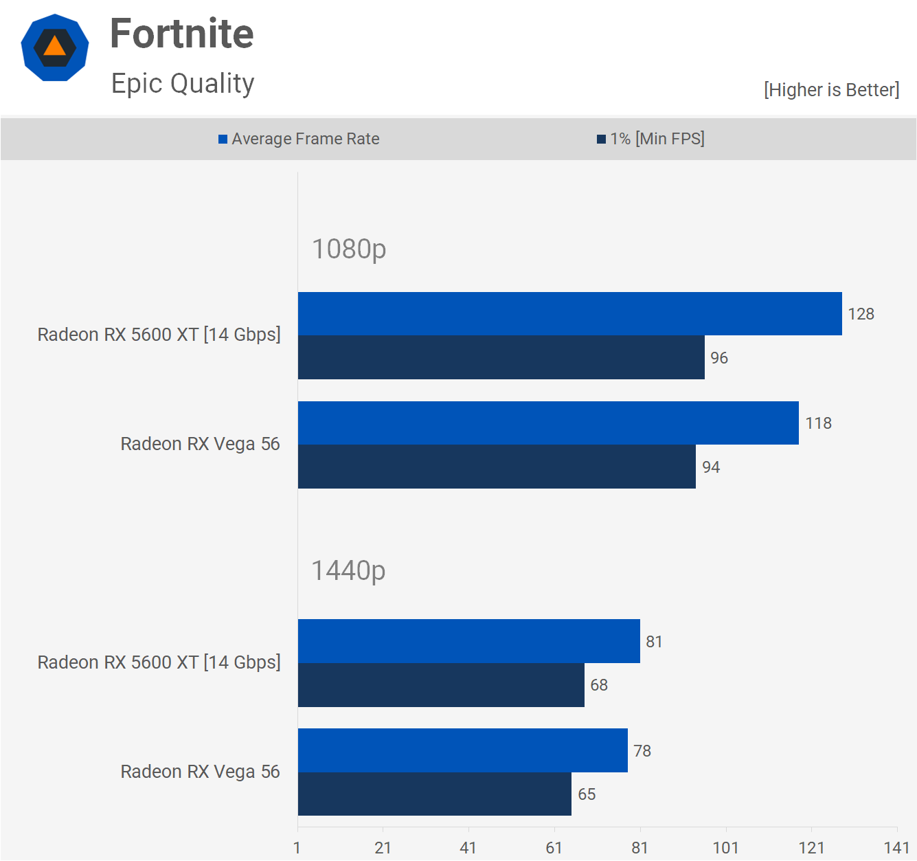 Le 5600 XT est également en mesure de devancer le Vega 56 de Fortnite, offrant 8% d'images supplémentaires en moyenne à 1080p. Les performances à 1440p sont fondamentalement identiques.