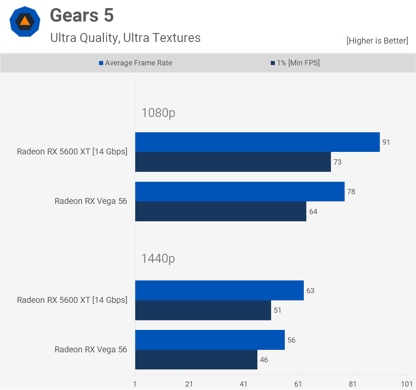 Ensuite, nous avons Gears 5 et ici, le 5600 XT offre de solides gains par rapport au Vega 56, augmentant les performances à 1080p de 17% et 13% à 1440p.