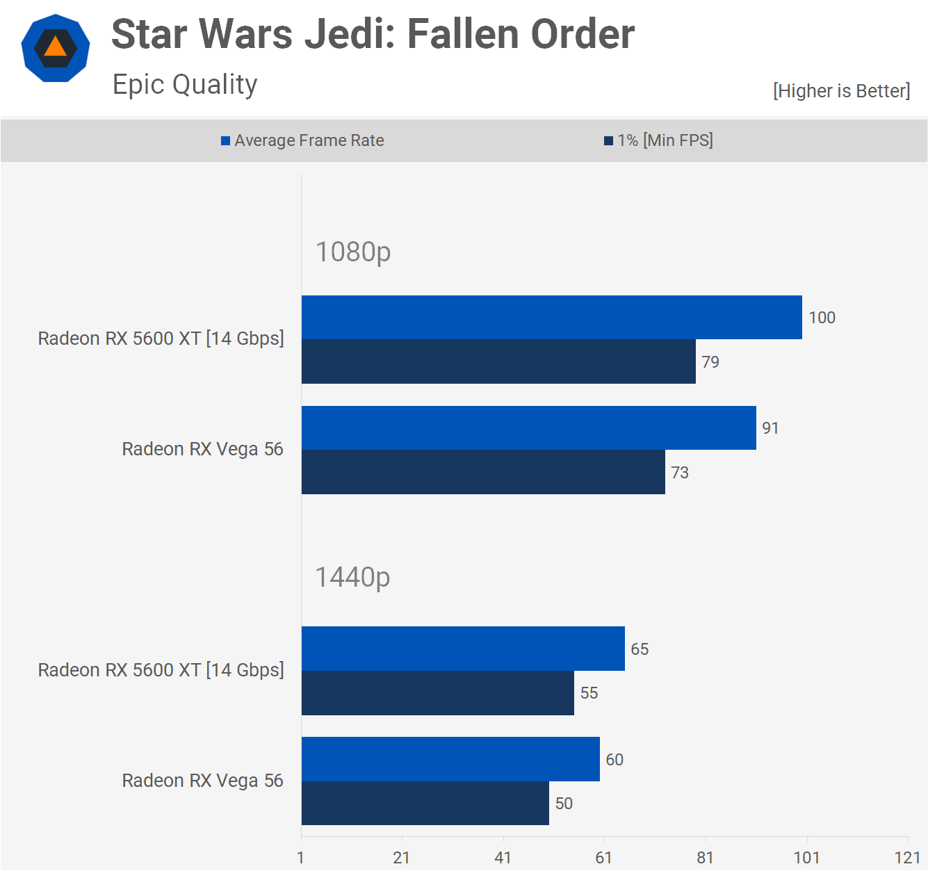Star Wars Jedi: Fallen Order est un autre exemple où le 5600 XT est jusqu'à 10% plus rapide que le Vega 56, un gain impressionnant compte tenu de la différence de consommation d'énergie.