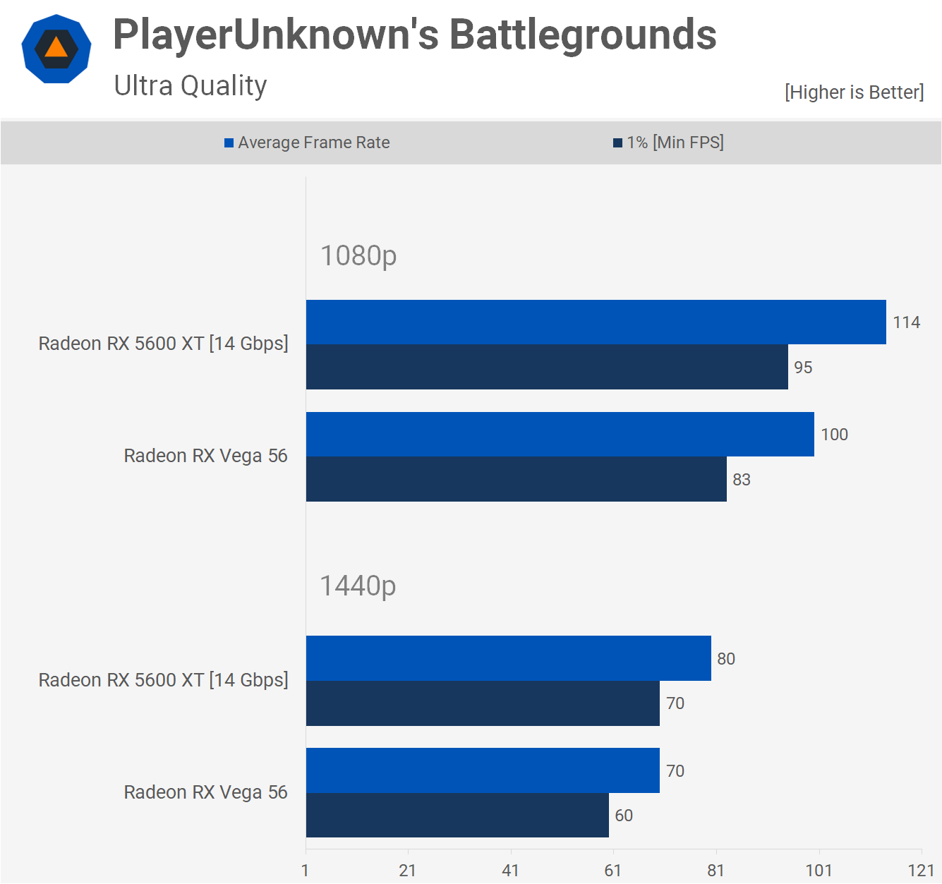 La dernière fois, nous avons vérifié PUBG, qui n'est généralement pas un titre fort pour AMD. Navi fait beaucoup pour améliorer la position d'AMD. Aux deux résolutions testées, le 5600 XT était 14% plus rapide que le Vega 56.
