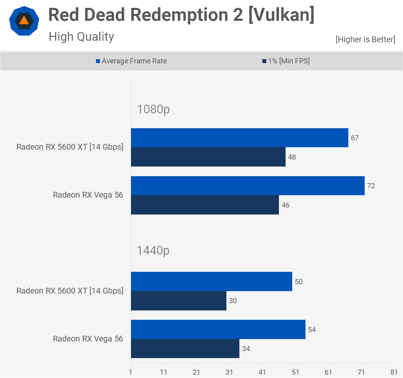 Les 2 Go supplémentaires de VRAM aideront le Vega 56 dans Red Dead Redemption 2, mais même ainsi, les performances sont toujours très proches avec le 5600 XT, avec une marge de 7% seulement.
