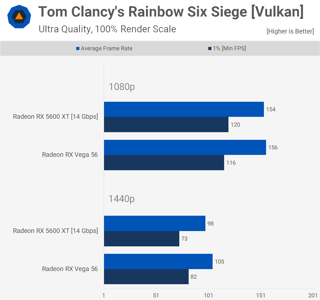 Nous voyons des performances pratiquement identiques dans Rainbow Six Siege en utilisant la nouvelle API Vulkan, bien que Vega 56 se détache toujours très légèrement à 1440p et encore une fois, nous pensons que cela est dû à ces 2 Go supplémentaires de VRAM.