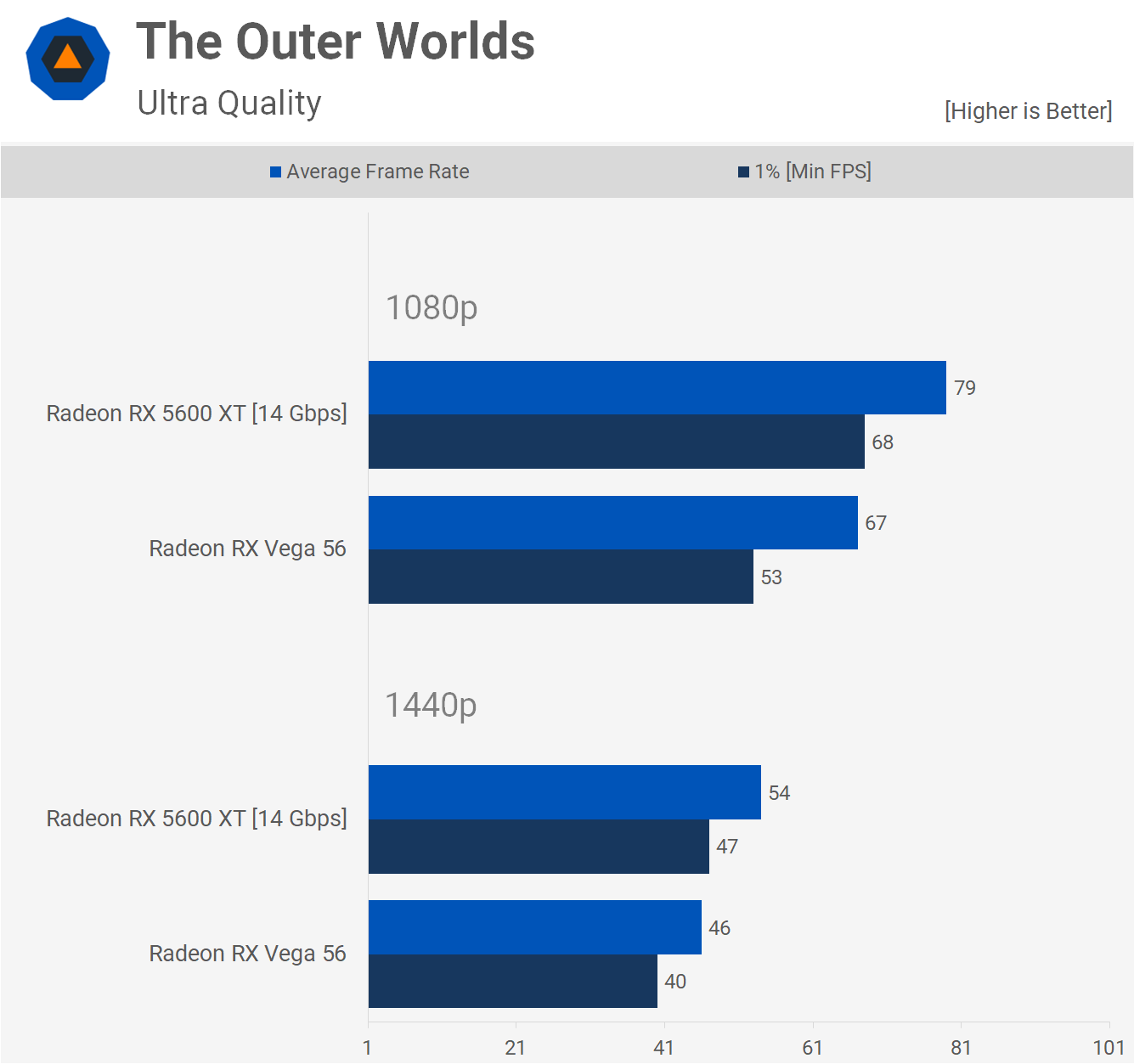 Les résultats d'Outer Worlds sont intéressants car AMD a toujours eu du mal avec son architecture GCN dans les jeux utilisant le moteur Unreal. Ici, le 5600 XT offre de gros gains de performances de près de 30% lorsque l'on regarde 1% de faibles performances et 18% pour la fréquence d'images moyenne, donc une grande amélioration des performances du Vega 56.
