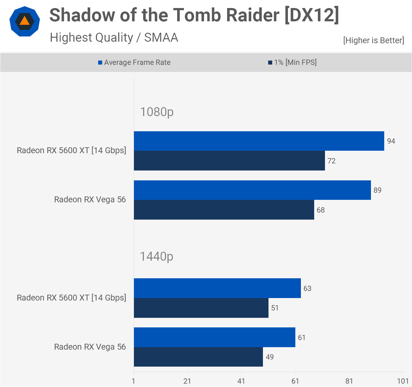 Les résultats de Shadow of the Tomb Raider sont compétitifs et ici, le 5600 XT est juste 6% plus rapide à 1080p tout en offrant des performances pratiquement identiques à 1440p.