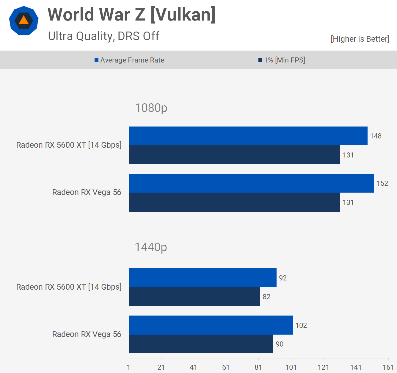 Les performances dans World War Z sont également compétitives, nous pensons que le Vega 56 fait un peu mieux à 1440p en raison de la VRAM supplémentaire, mais dans l'ensemble, nous envisageons une expérience de jeu très similaire avec l'un ou l'autre des GPU.