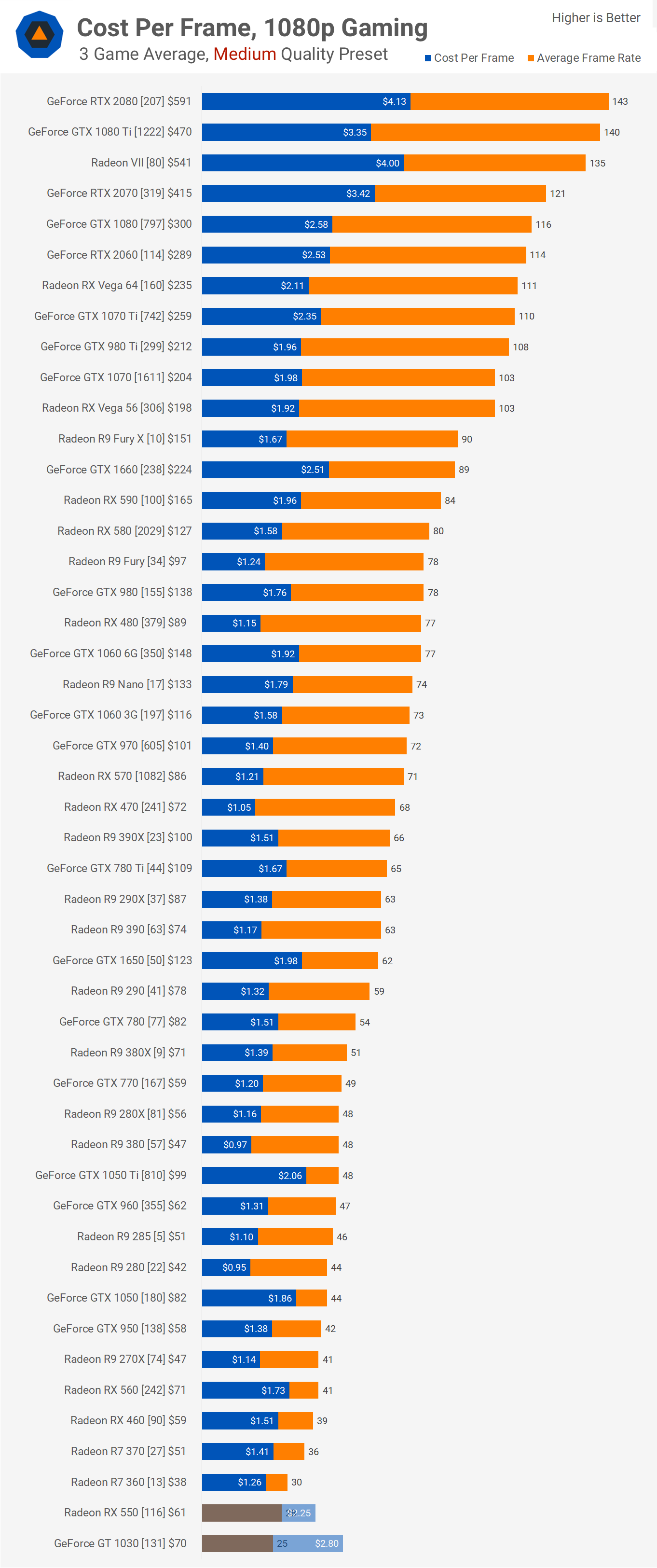 Ce graphique contient quelques points de données différents. Le long du nom de chaque carte graphique, suivi entre parenthèses est le nombre d'articles vendus depuis le début de l'année sur Ebay et à côté de cela est le prix de vente moyen des 12 dernières annonces réussies. Les barres bleues nous montrent le coût par image résultant et en orange le fps moyen.
