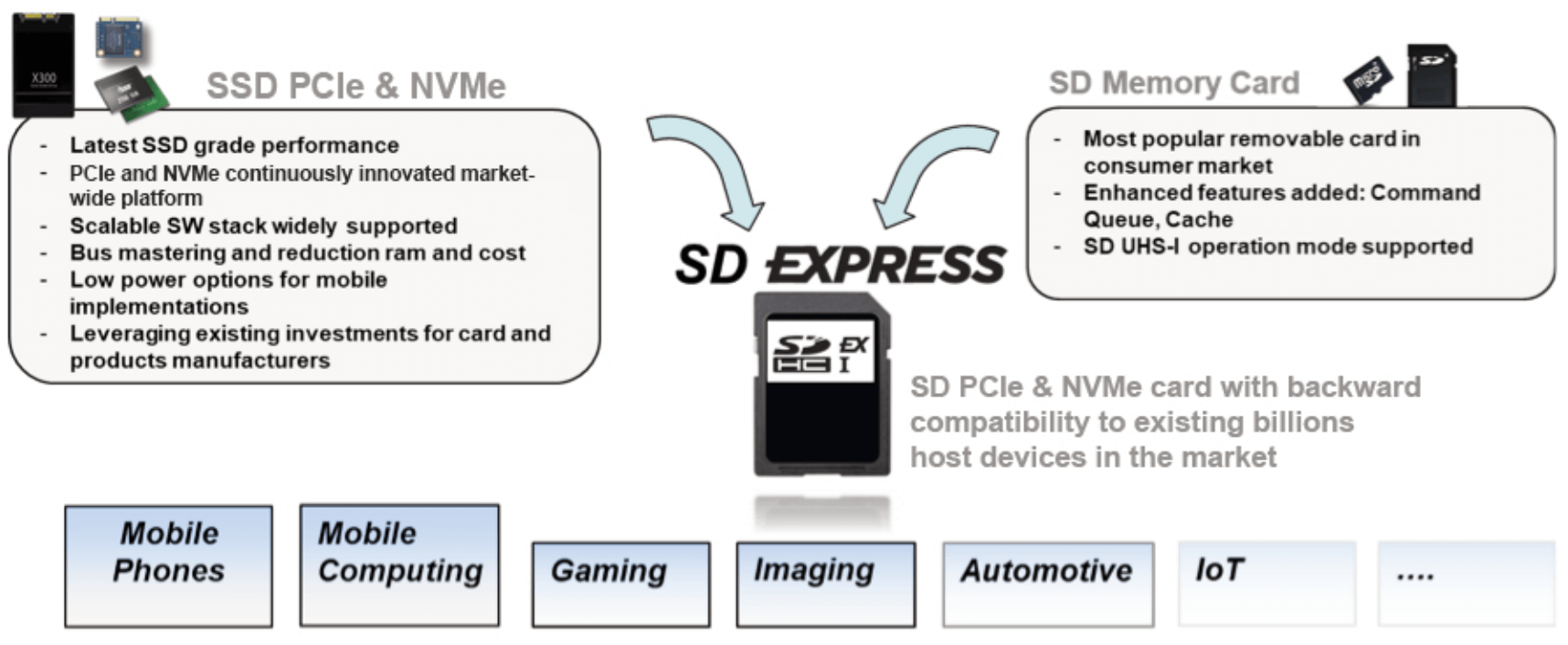 Imaginez si chaque périphérique électronique avec stockage que vous possédiez remplaçait ses interfaces lentes par des disques SSD NVMe. Offrant des vitesses équivalentes à celles de nombreux disques SSD, les cartes SD Express seront, sur le plan fonctionnel, similaires aux disques SSD amovibles. L'utilisation de PCI Express et de NVMe permettra des débits de données plus rapides tout en offrant une compatibilité ascendante aux dépens de la vitesse.