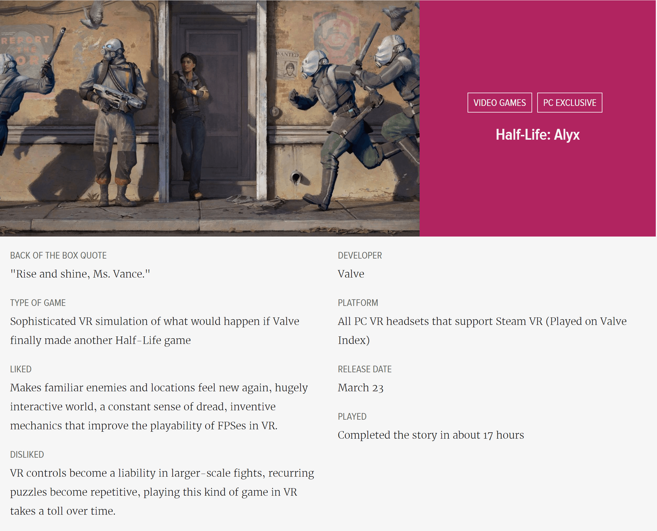 Le jeu a convenu. Après les cinq premières heures environ, Alyx enlève ses gants d'enfant. Cela conduit à certains des meilleurs moments du jeu: les hautes eaux ne sont pas Demi-vie: Alyx, mais pour Demi vie en général. Quand Demi-vie: Alyx arrête d'essayer de rendre hommage aux ennemis et aux rencontres qui ont précédé et apporte tout nouveau (au moins, pour Demi vie) des idées à la table, elle plane plus souvent qu'elle ne faiblit.
