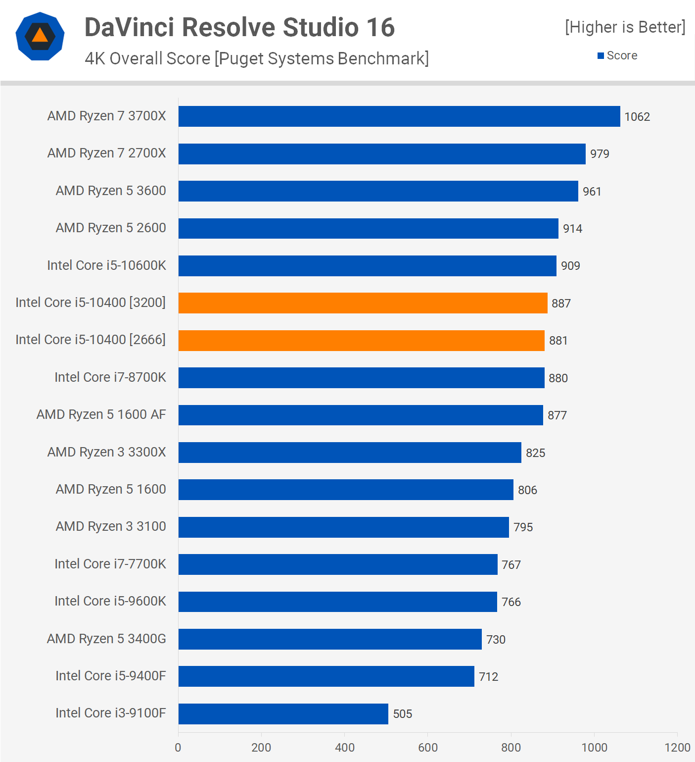 En passant à DaVinci Resolve Studio 16, nous constatons que la mémoire plus rapide a peu d'influence sur les performances. En comparant les configurations DDR4-3200, le Ryzen 5 3600 était toujours 8% plus rapide, pas une marge énorme mais pour un processeur qui coûte généralement moins cher, c'est un bon résultat pour AMD.