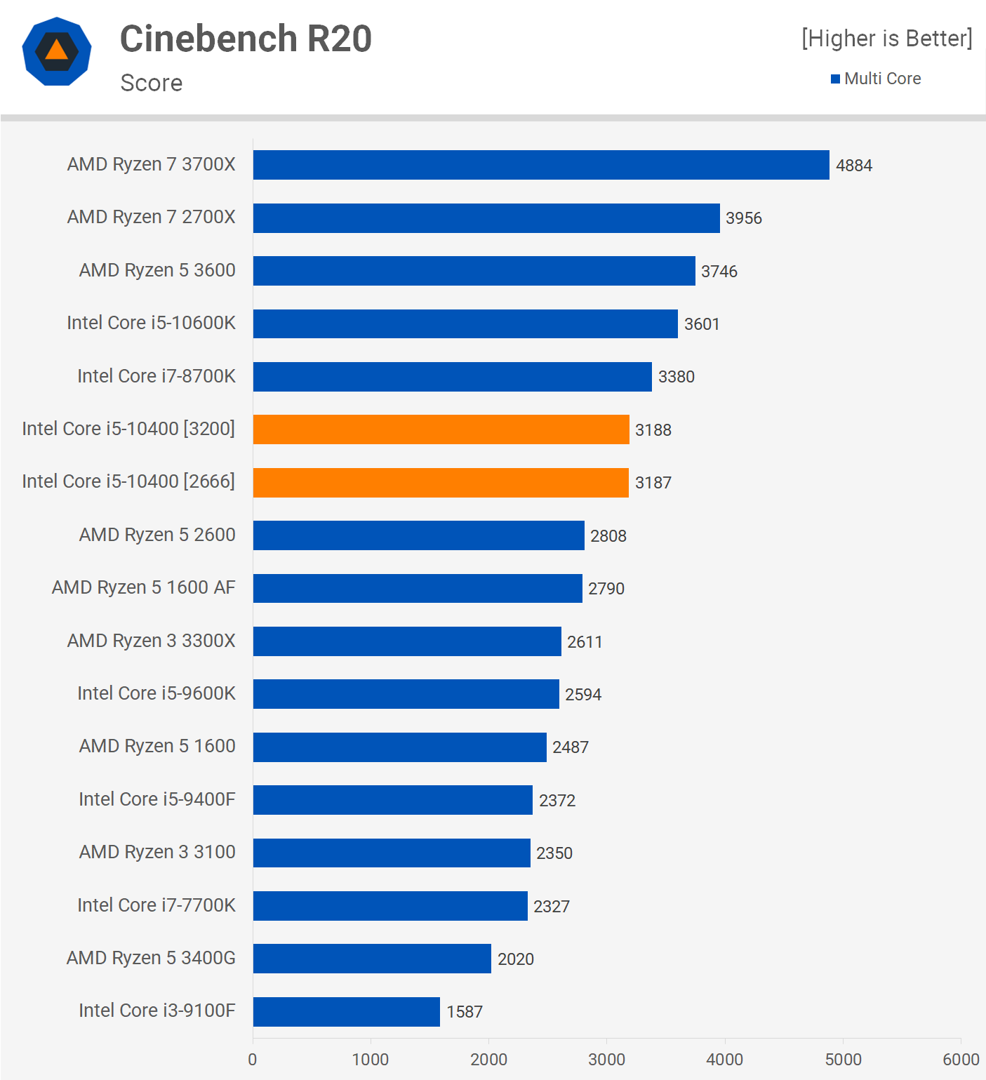Le Cinebench R20 multicœur commence en premier et dès le départ, nous constatons que la vitesse de la mémoire n'a pas d'impact sur ces charges de travail de rendu, car le Core i5-10400 produit essentiellement le même résultat en utilisant la mémoire DDR4-3200 ou 2666.