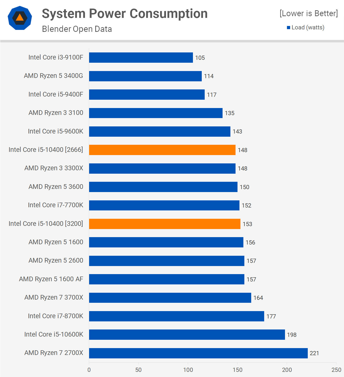 En ce qui concerne la consommation d'énergie, nous constatons que bien que le Ryzen 5 3600 ne soit pas meilleur que le 10400, il consomme à peu près la même quantité d'énergie pour environ 10% de meilleures performances.