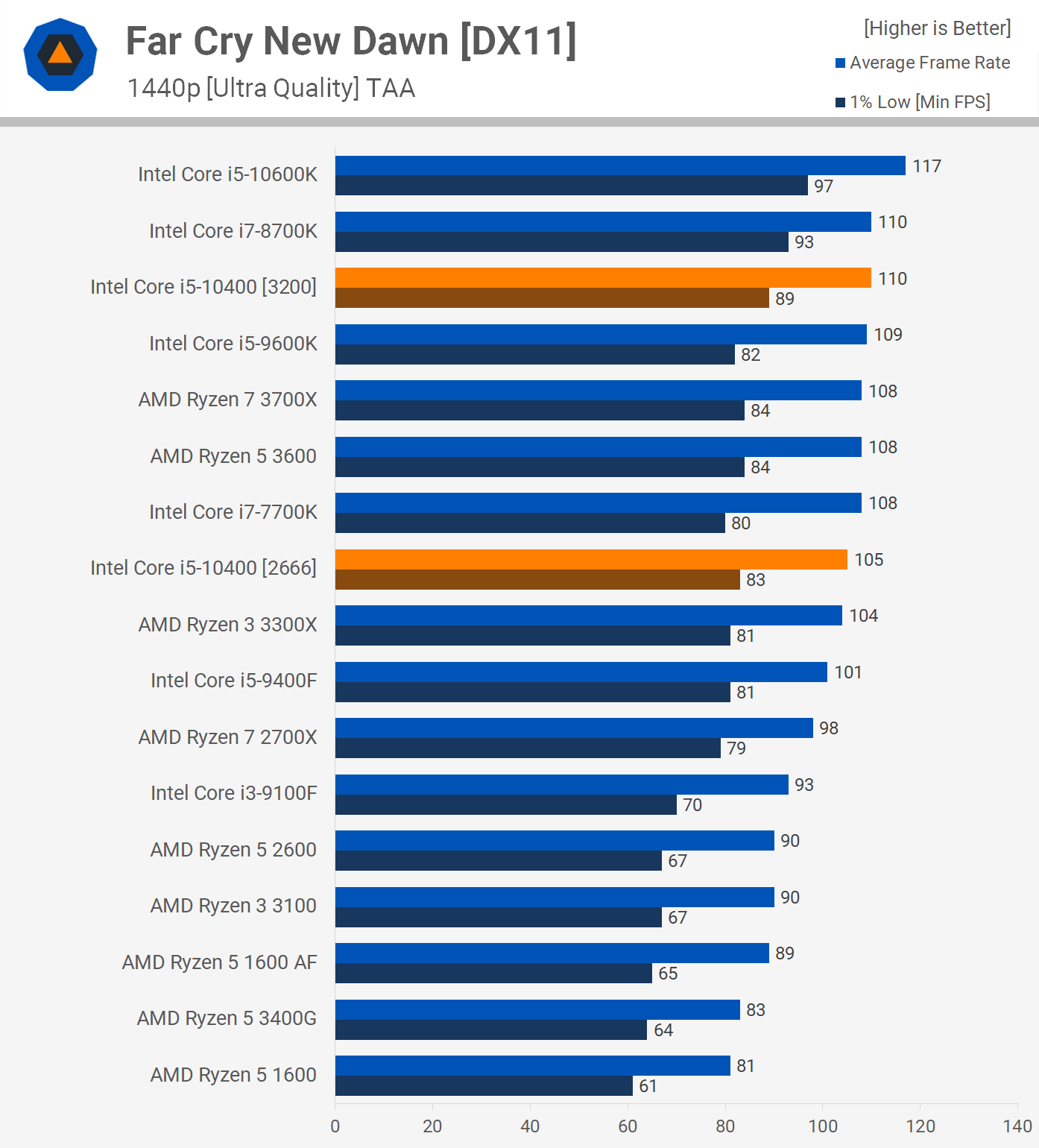 Far Cry New Dawn nous montre généralement le pire des scénarios pour Ryzen, mais le 10400 semble correspondre au 3600 ici lorsqu'il utilise la même mémoire DDR4-3200. L'utilisation de DDR4-2666 voit le 10400 glisser un peu en arrière mais à peine.