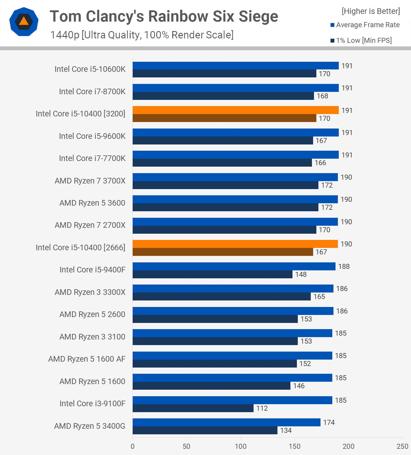 Sauter jusqu'à 1440p réduit les marges pour la plupart et le 10400 fonctionne à peu près de la même manière en utilisant la mémoire DDR4-2666 ou 3200.