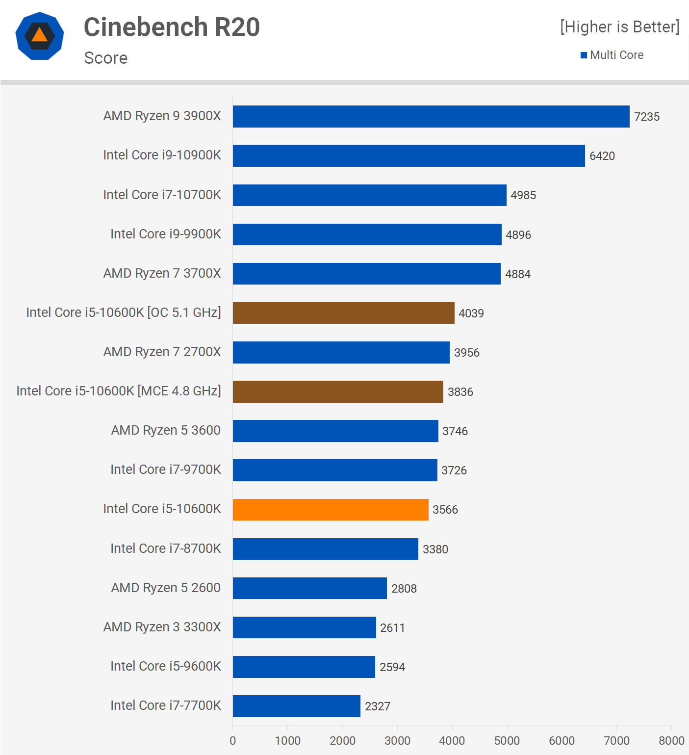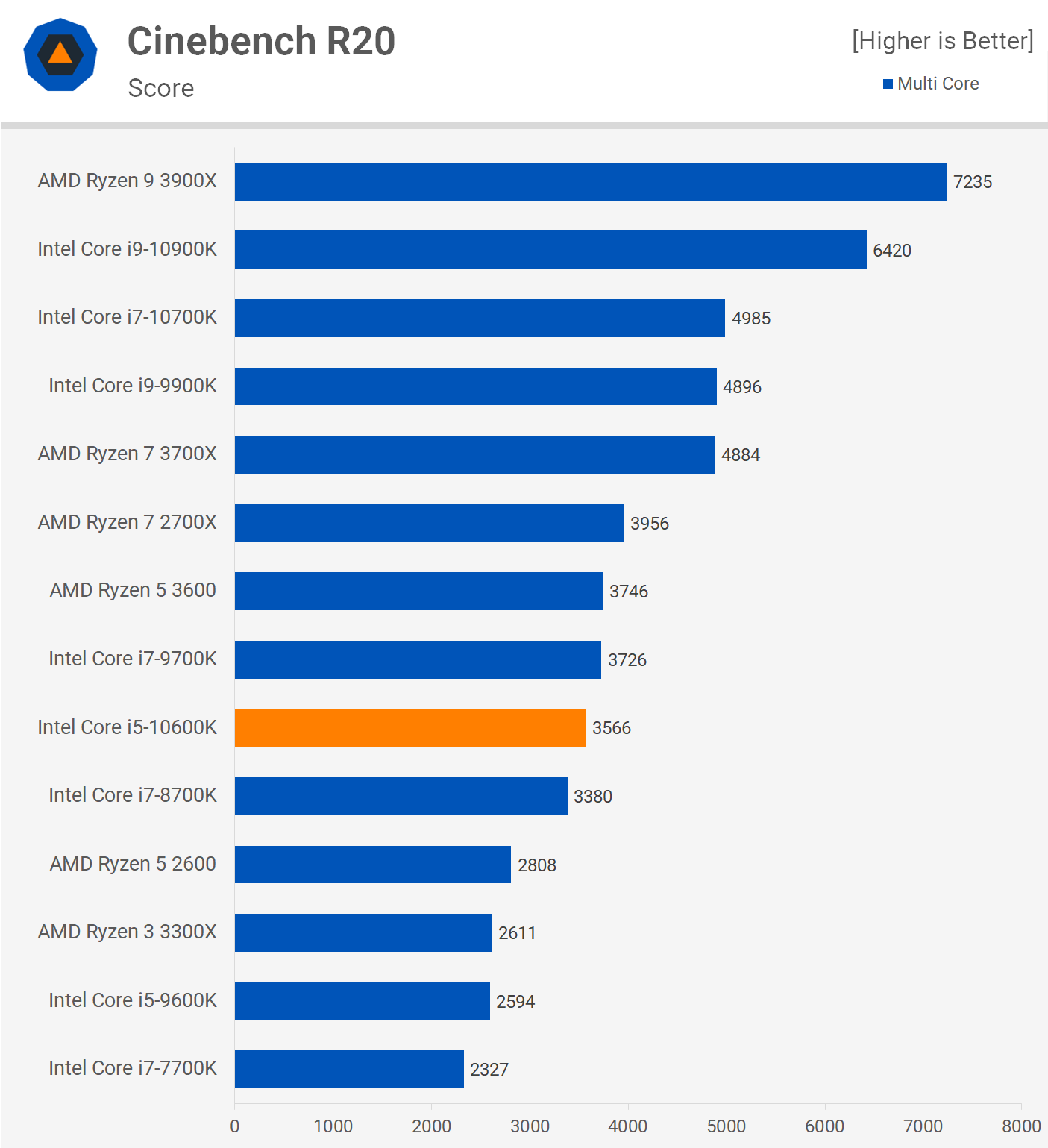 Tout d'abord, voici un aperçu des résultats multicœurs du Cinebench R20 et nous voyons ici que le 10600K est 6% plus rapide que le 8700K, un résultat assez surprenant compte tenu des spécifications. Malgré le résultat étonnamment fort par rapport au Core i7 de 8e génération, le 10600K était toujours 5% plus lent que le Ryzen 5 3600 et 27% plus lent que le 3700X.